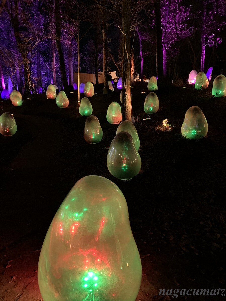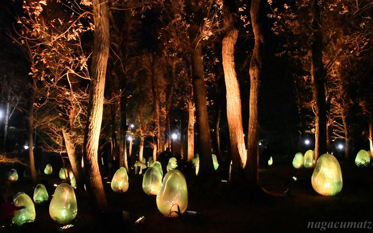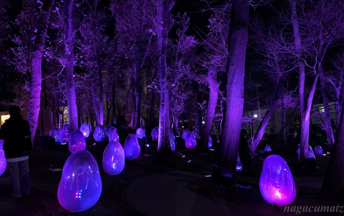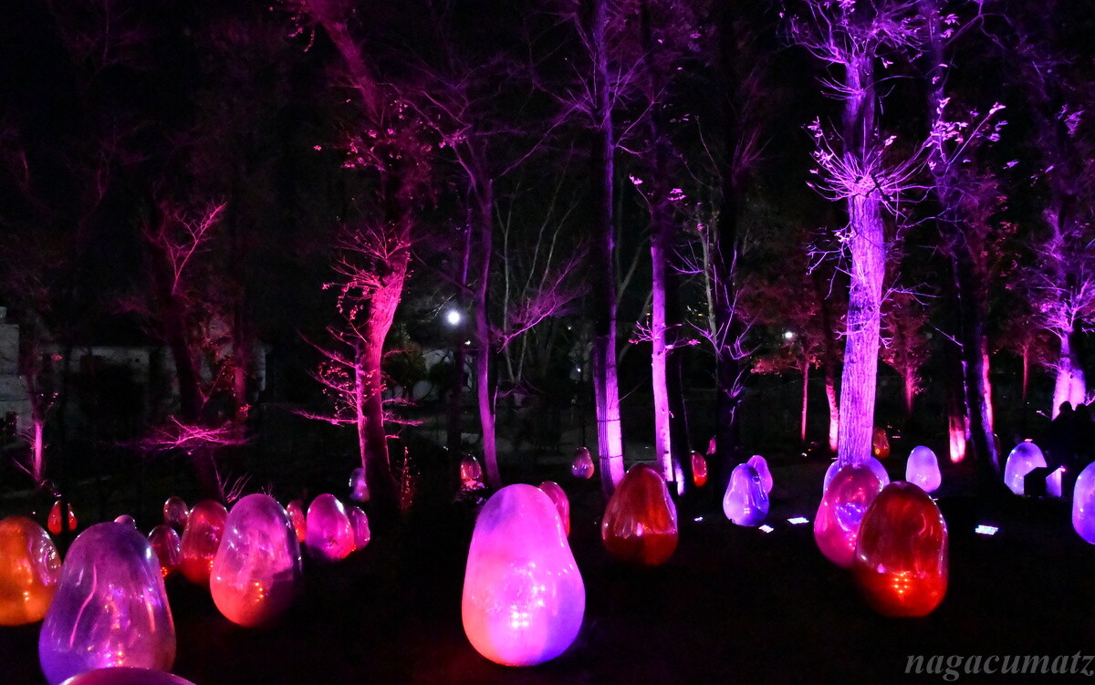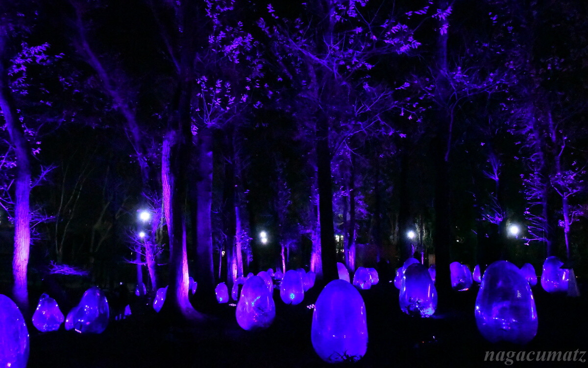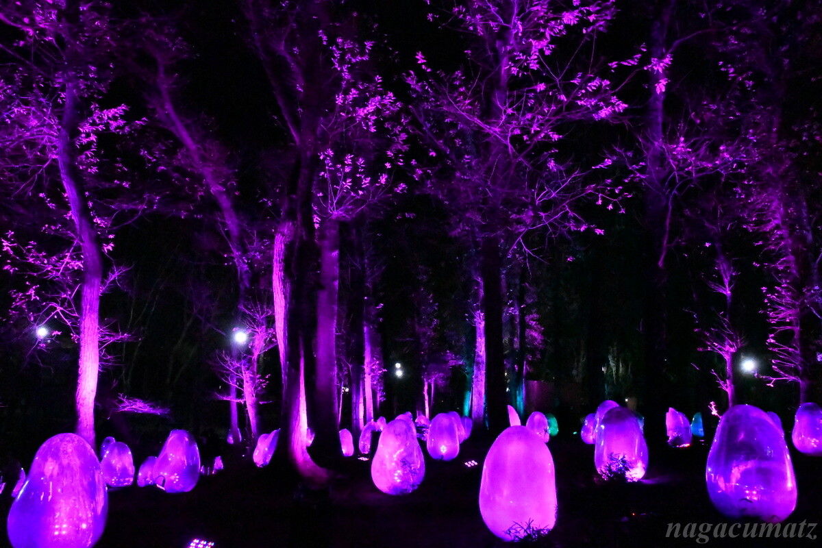 埼玉の「ところざわサクラタウン」にある武蔵野樹林パークで、チームラボの「どんぐりの森の呼応する生命 the Acorn Forest」を見に行った。武蔵野の雑木林を代表するコナラなどの落葉広葉樹の森を、角川武蔵野ミュージアムは武蔵野樹林としている。縄文時代の日本では落葉広葉樹林が広がり、落葉広葉樹林はどんぐりの実がなる樹木で、どんぐり類は縄文人にとっては主要な食料だった。縄文時代の多くの人々は、どんぐりという食料が豊富で、明るくて住みやすいどんぐりの森と共に生きていた。非物質的であるデジタルアートによって「自然が自然のままアートになる」という「Digitized Nature」というアートプロジェクトを行うにあたり、武蔵野のどんぐりの森が、人々の存在によって変化する光のアート空間になるようにと制作。