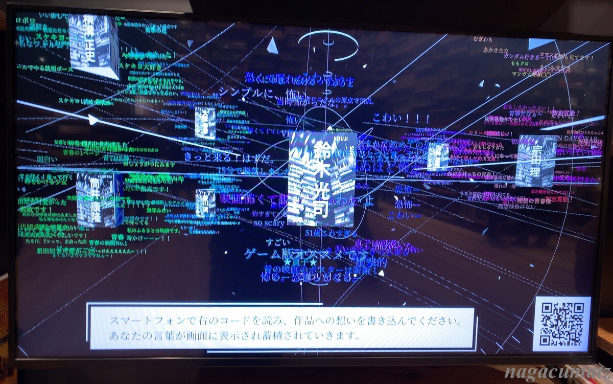 色々な作家さん名が画面に現れ、QRコードから携帯で感想などを打ち込むと、画面上に現れるしくみになっている。