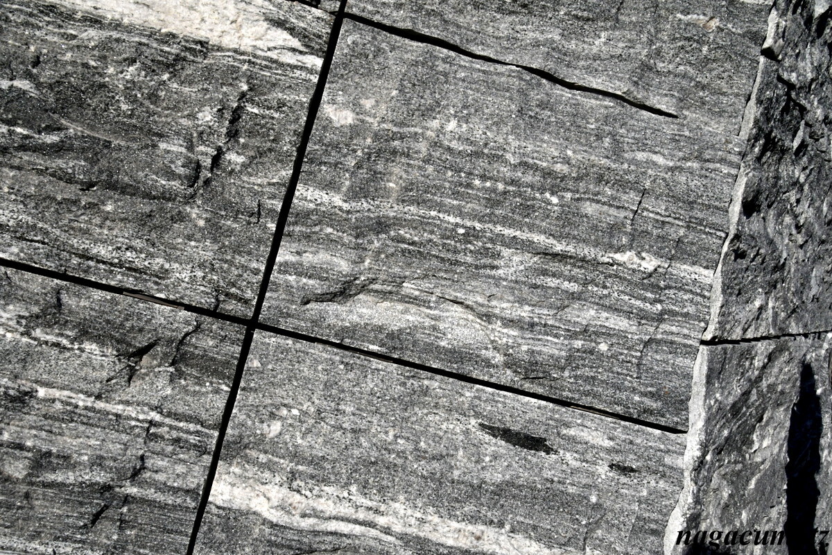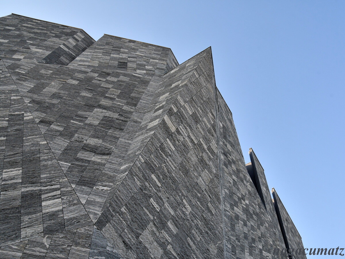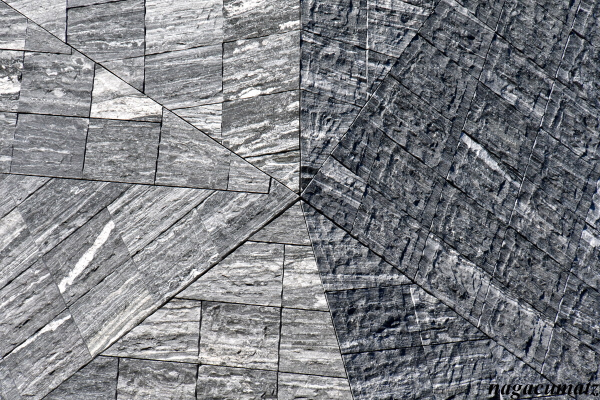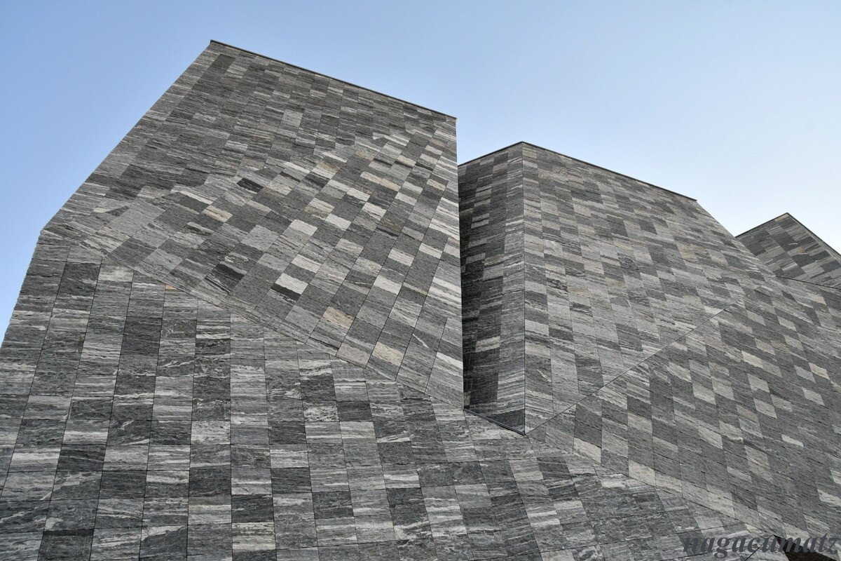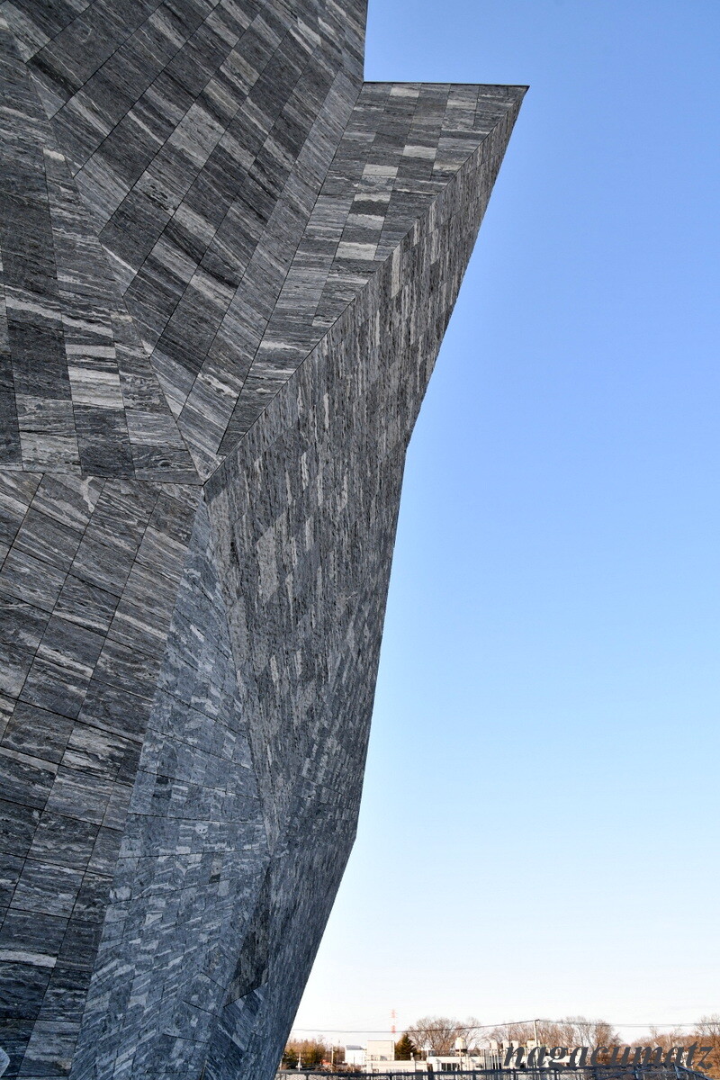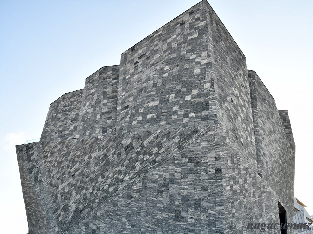 花崗岩の中でも模様が強いものとして、中国の山東省から切り出した岩を、割肌仕上げと言う手法により、でこぼこの凹凸をつけている。割肌仕上げにより、天気によって光の変化で表情も変わる。自然の岩や洞窟に居るイメージを。通常、ビルなどでは厚さは3センチの物を使うが、ここでの厚みは7センチ。一枚が約50~70キログラムの重さがあり、約2万枚、10トントラック120台分を使用している。