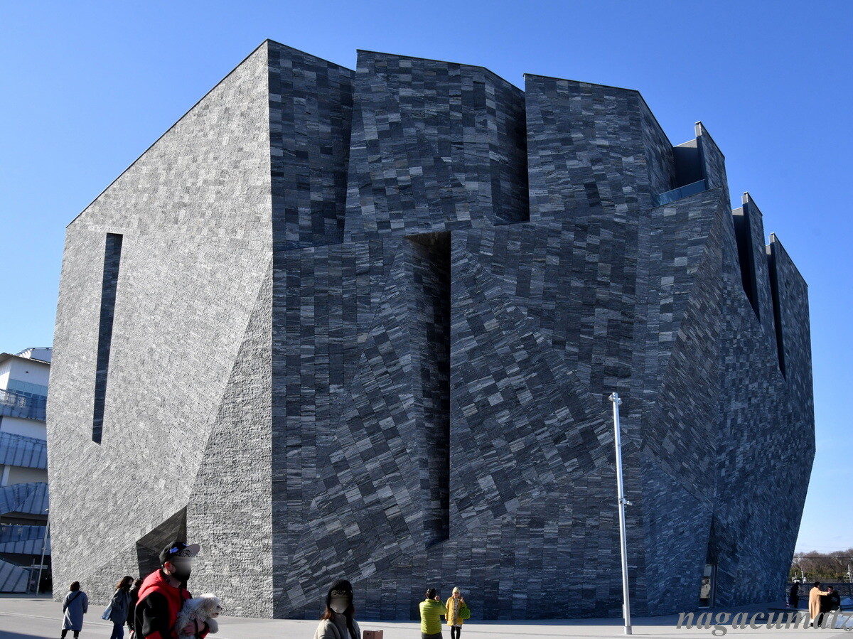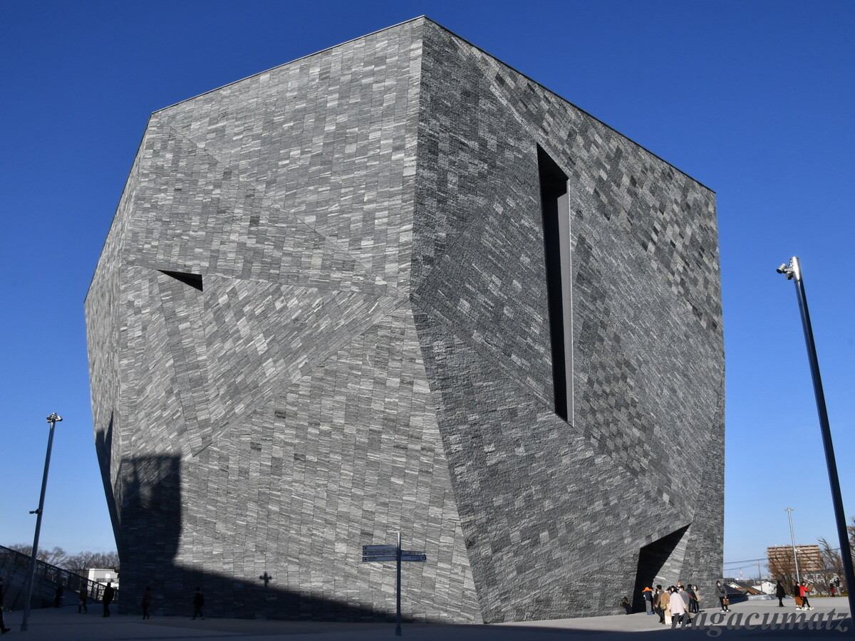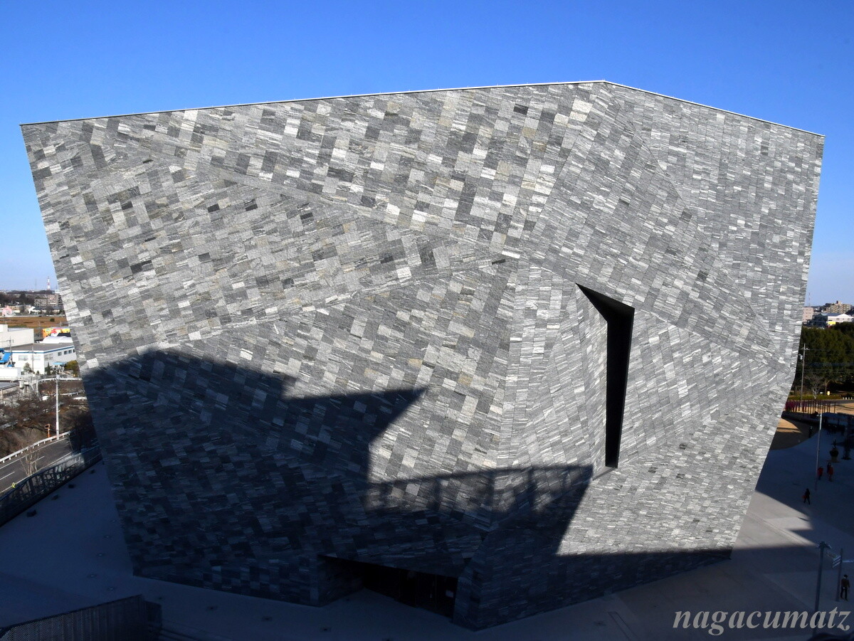 高さ30メートルの建物は、巨大な岩の塊に見える。武蔵野台地は地殻のプレートの動きで出来た非常に特別な地形で、武蔵野台地の持つ地殻がそのまま飛び出して来て固まったと言うイメージからなのだそう。日本では、磐座(いわくら)信仰(=神が降りるよりしろ)があり、外国でも聖地は必ず岩に関係している、岩の持っている力をもう一度建築に取り戻したいと言う発想から。