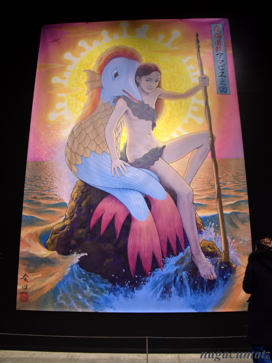 2階エントランスでは、引き伸ばされた大型パネルの会田誠氏が描いた「疫病退散アマビヱ之図」(2020)が出迎えていた。今後も「コロナ時代のアマビエ」をテーマに、鴻池朋子氏、川島秀明氏、大岩オスカール氏、荒神明香氏らが作品をリレー形式で制作し展示する予定なのだそう。