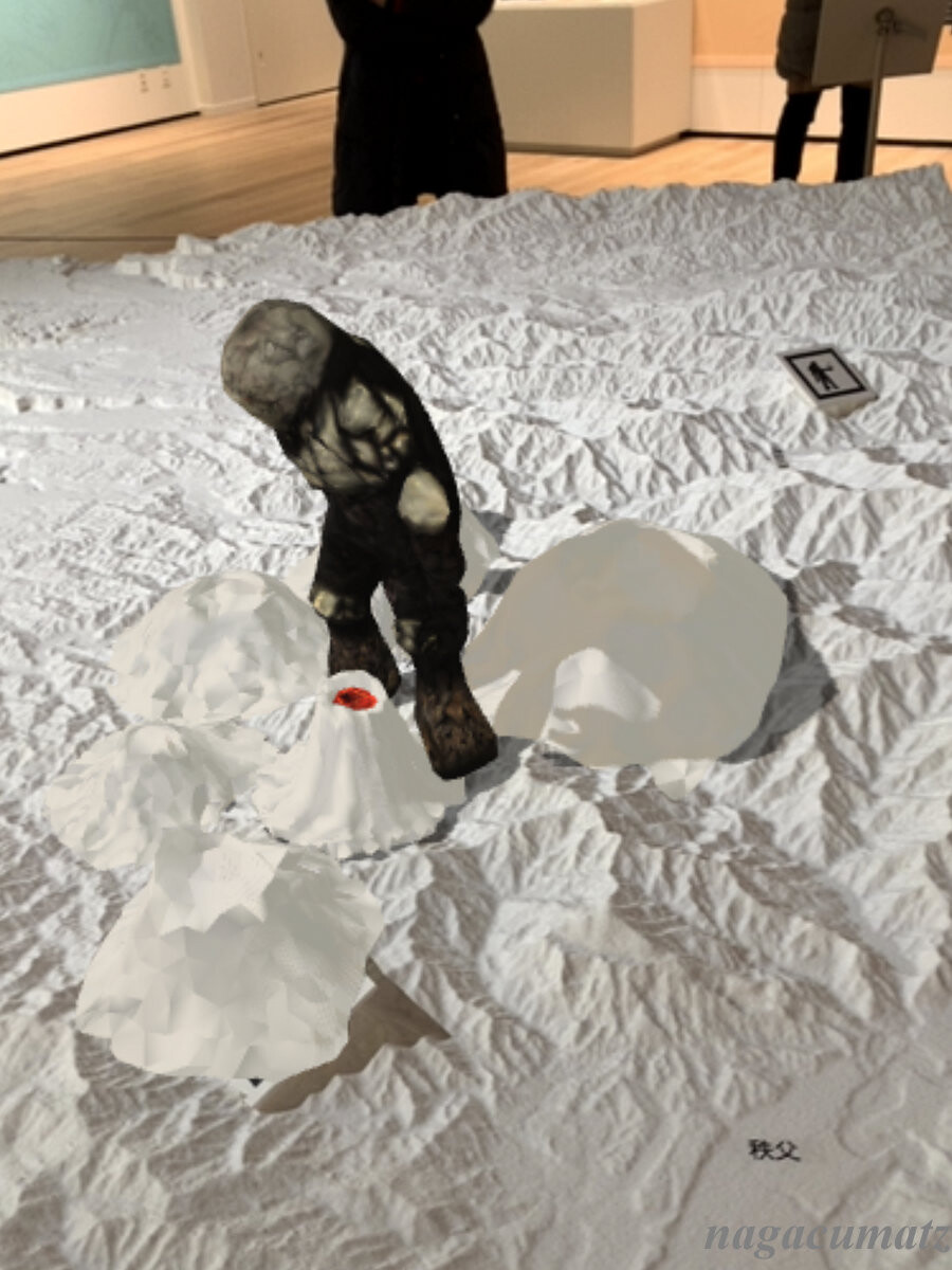 「武蔵野ギャラリー」では、武蔵野をテーマとした「武蔵野三万年ことはじめ」と題した展覧会を開催。武蔵野は、三万年の太古から人が住み、中世より歌にも読まれてきたそうで、角川書店の創業者である角川源義氏が50年代に撮影した武蔵野の風景写真や、柳田國男氏や折口信夫氏らの研究も。また、イラストレーター・Toy(e)が描き下ろした武蔵野の巨人「ダイダラボッチ」も展示されており、ジオラマの部分にあるQRコードを携帯で読み込むと、仮想のダイダラボッチが携帯の画面に現れるしくみになっていて面白かった。