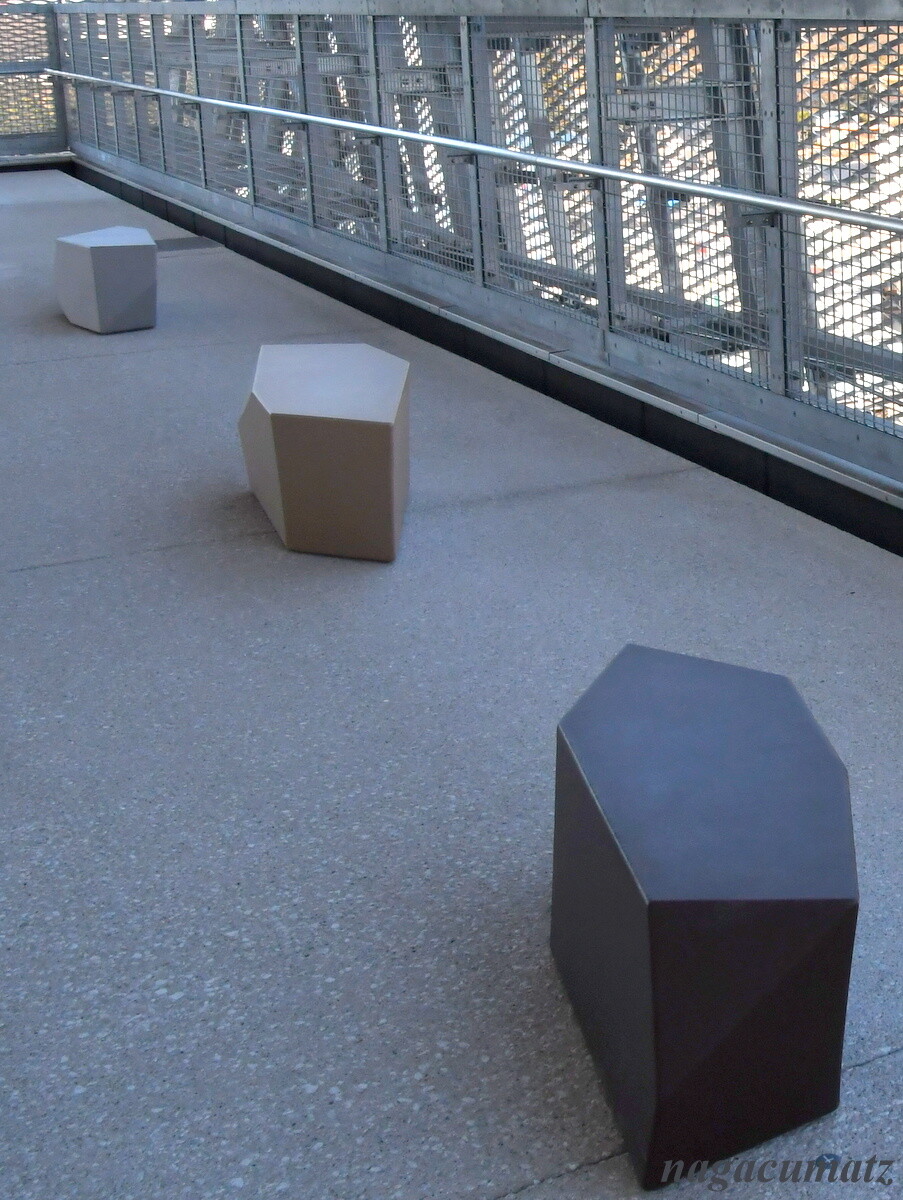 外のベンチも色も形も個性的になっているが、堅いコンクリートなどではなく、クッションがきいているのにはビックリ。
