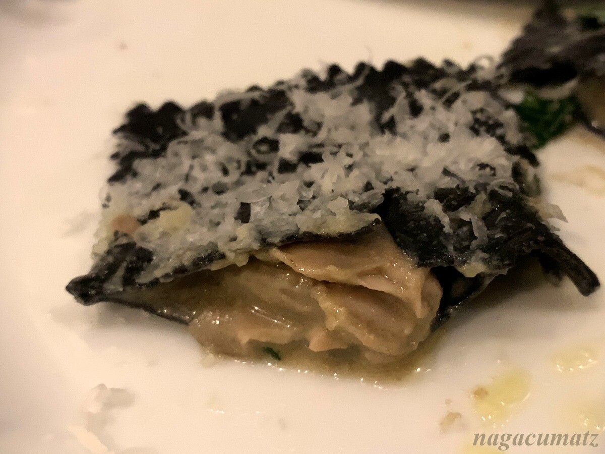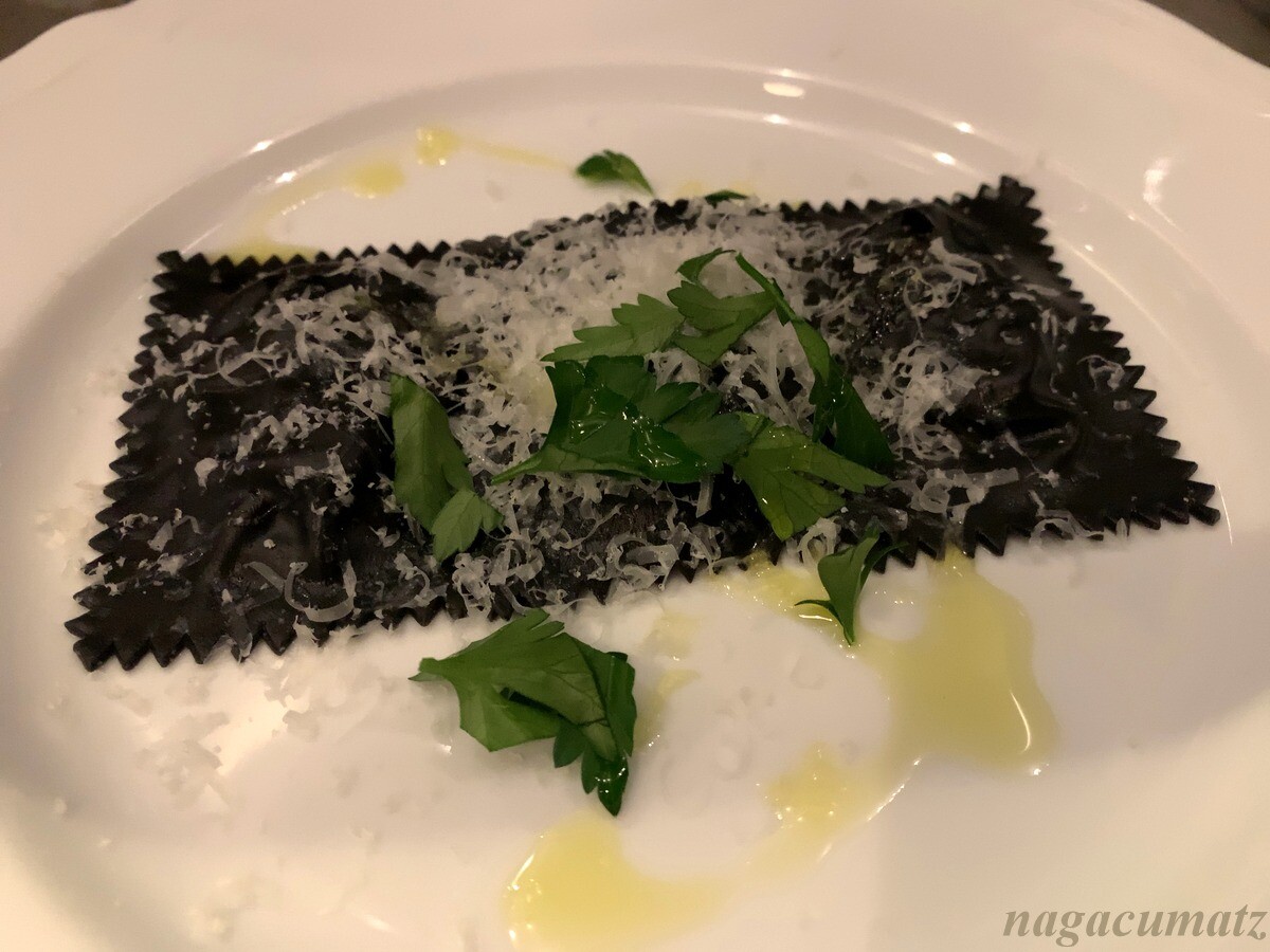 イカスミのラビオリ 牡蠣とクルミのペースト 1580円。牡蠣がゴロンゴロンと入っている。