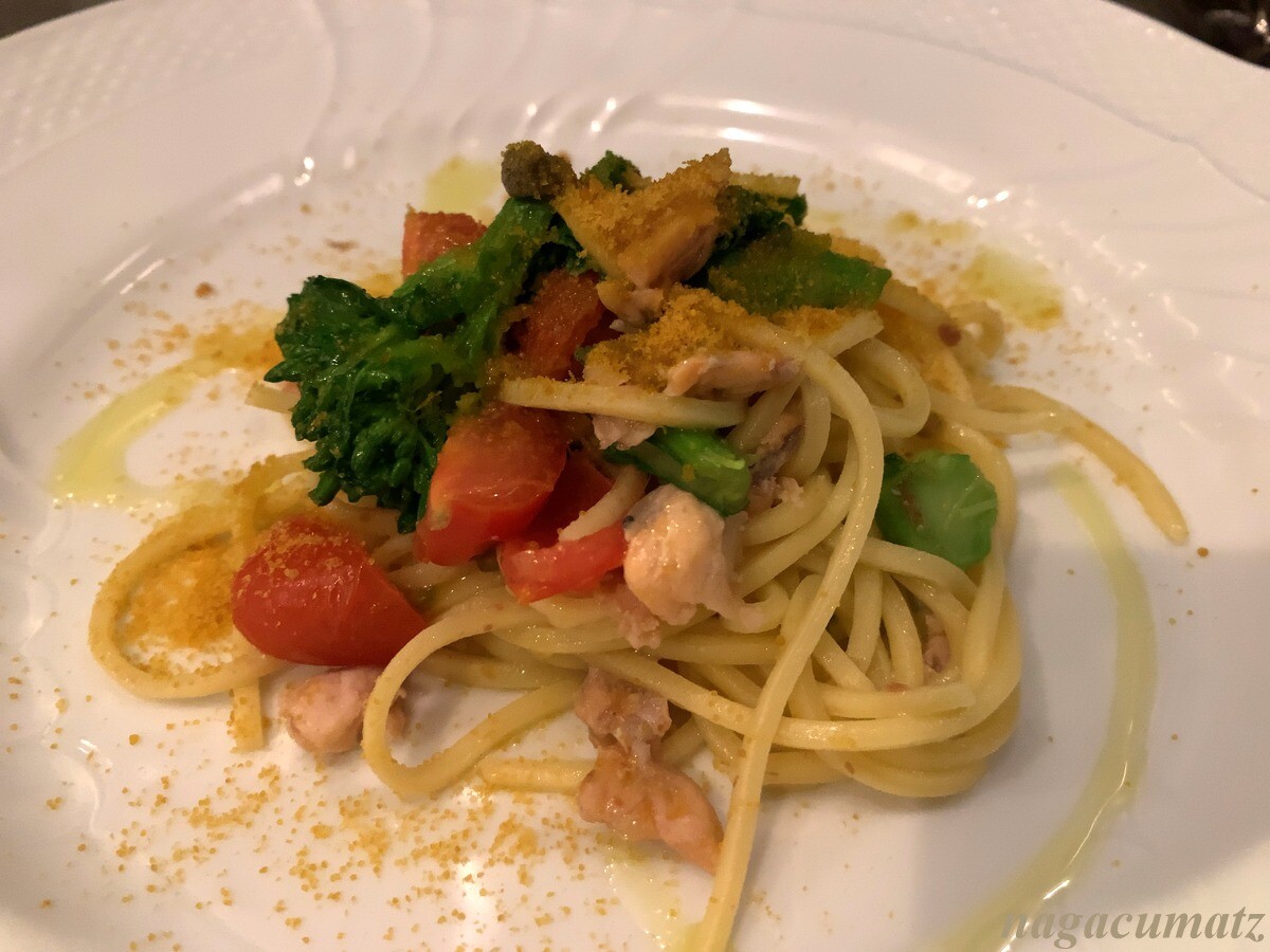 タリオリーニ 秋鮭 ボッタルガ 1580円。鮭に菜の花やトマトが入るが上からたっぷり香りの良いカラスミがかかる。