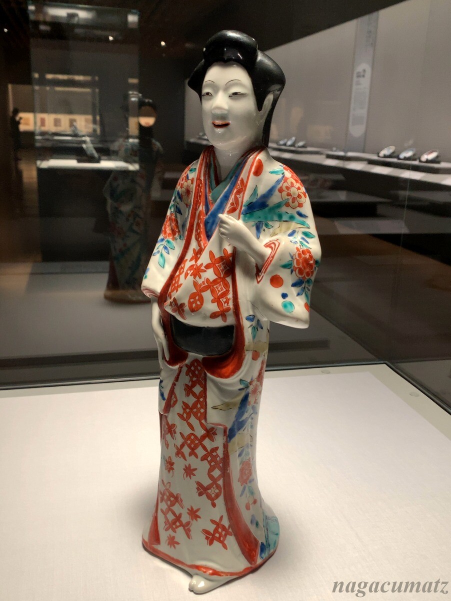 輸出向け製品と言われ、作者は「伊満利の柿右衛門」、人形のモデルは島原遊郭の遊女「吉野太夫」と。俳人の小西來山も同じ人形を持ってたのだとか。