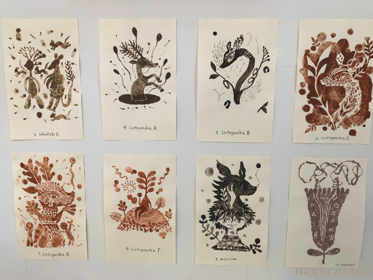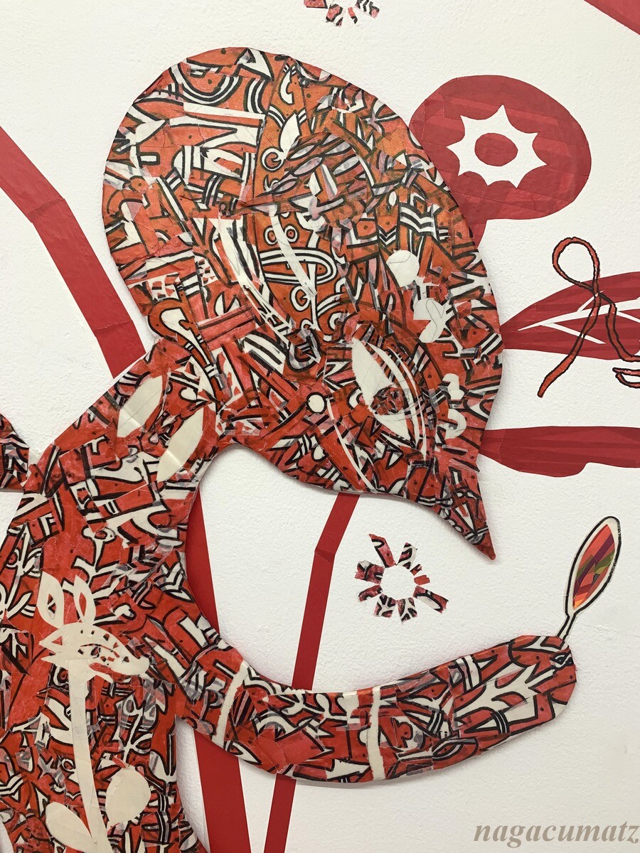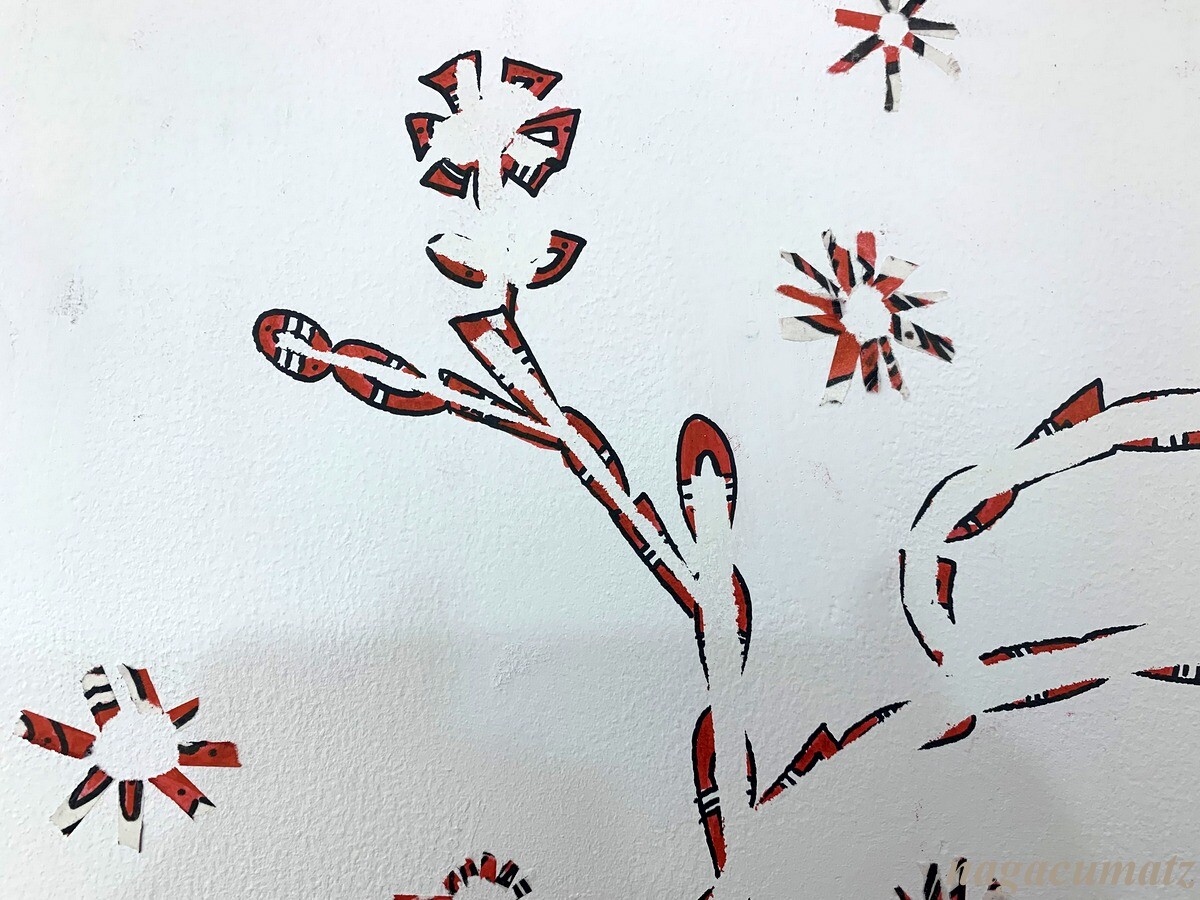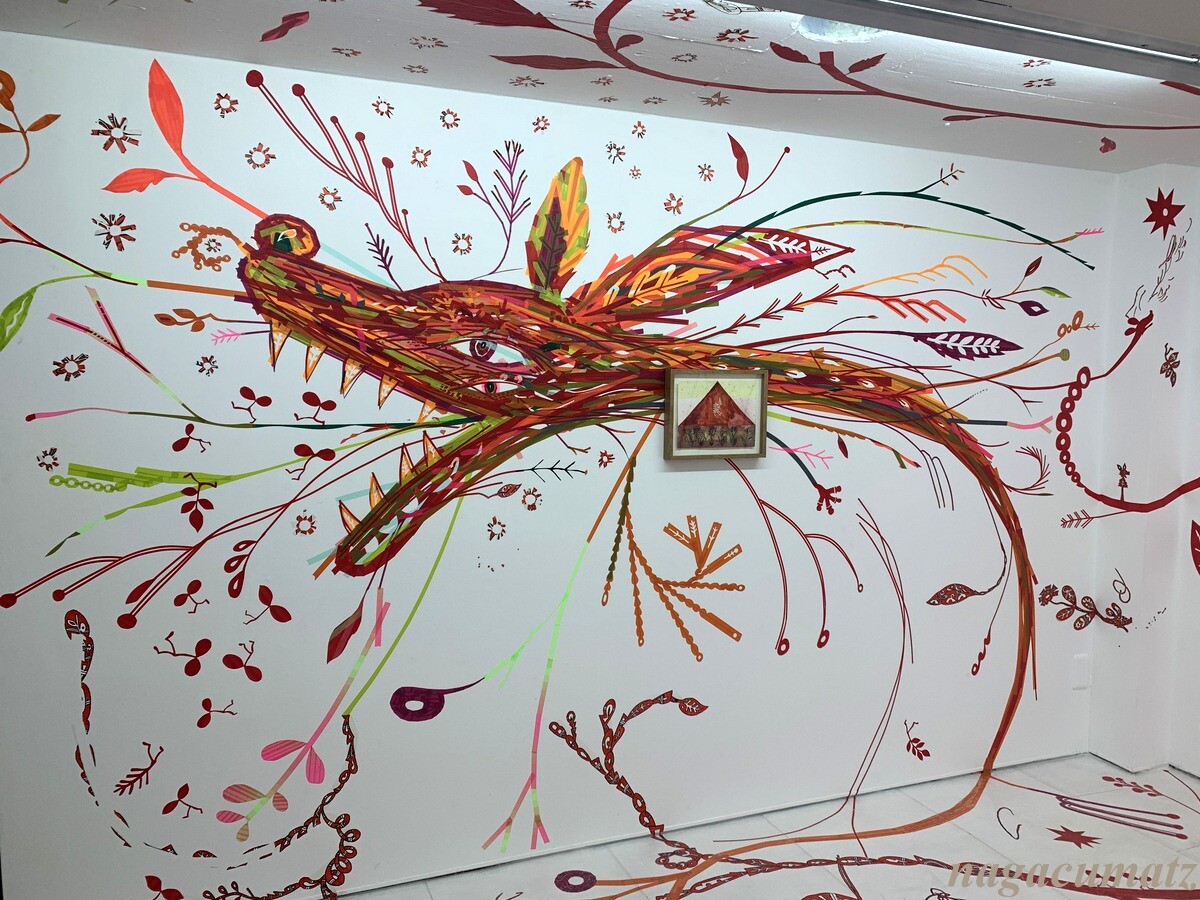 主に、各地で採取した土と水で描く「泥絵」シリーズ、アスファルト道路に用いられる熱溶着式路面標示シートをバーナーで焼き付けて描く「白線」シリーズ、マスキングテープに耐水性マーカーで描く「マスキングプラント」シリーズの三つに分類されるが、今回「マスキングプラント」による新作が展示室内の全面に描かれている。