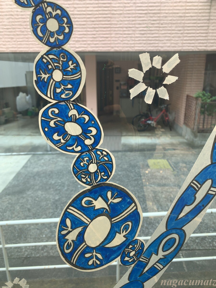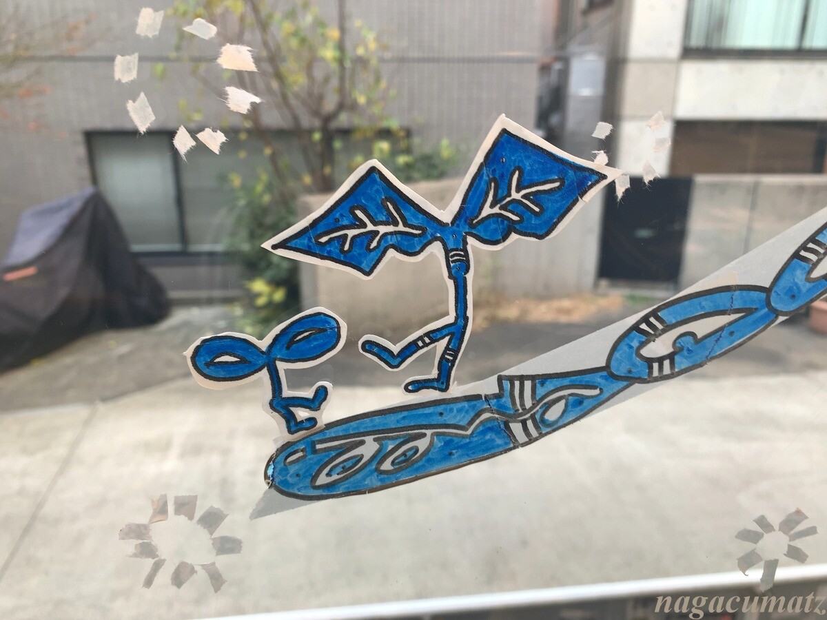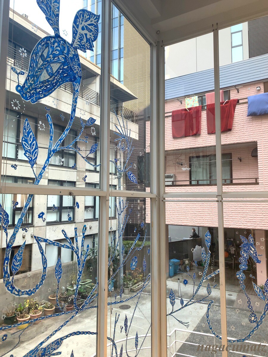 ギャラリーの高いガラス窓にも、マスキングプラントによって描かれている。