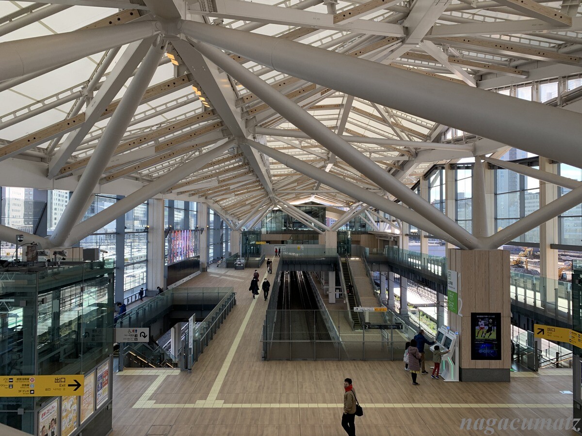 昨年開業した隈研吾氏設計の「高輪ゲートウェイ駅」は、いつも山手線で通過するものの、降り立ったことがなかったので寄ってみた。