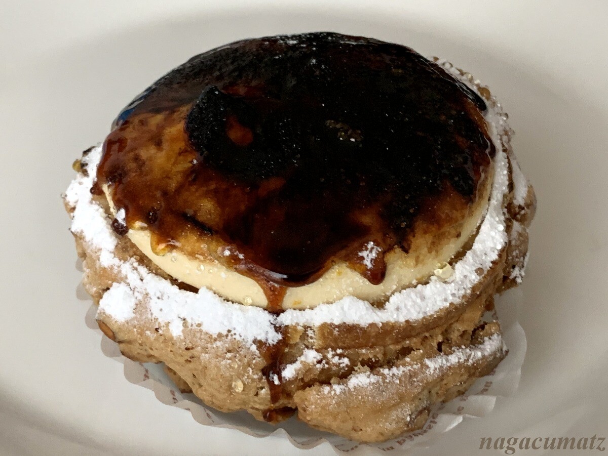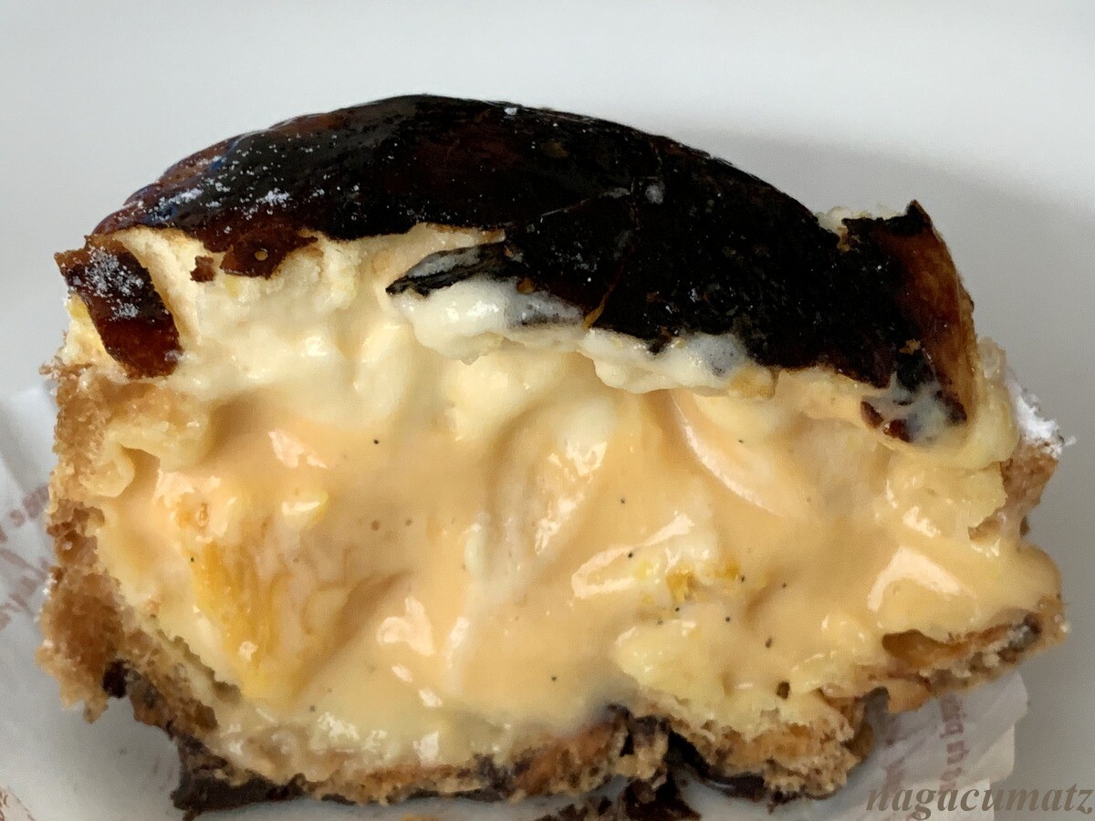 ピュイダムール 532円 シュー生地だが、中にはオレンジとラム酒の香りがしっかりしたカスタードクリームが入っており、上にはオレンジピールが入ったシブーストクリームとなっている。食感が色々で楽しめ、オレンジの香りも良い。
