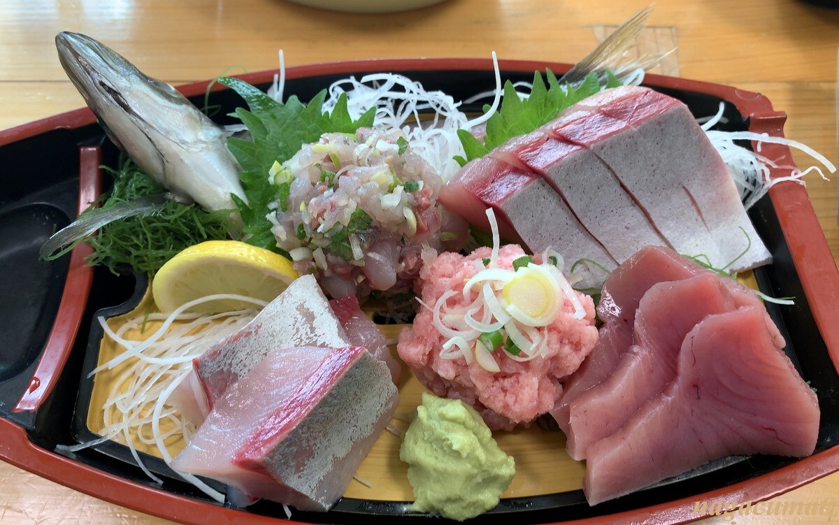 お刺身上定食 2000円 左手前はいなだ、右手前はめじまぐろ、奥はわらさ、鯵やトロもつく。とにかく一切れの分厚さにビックリ。美味しい。そしてこのお値段にもビックリ。