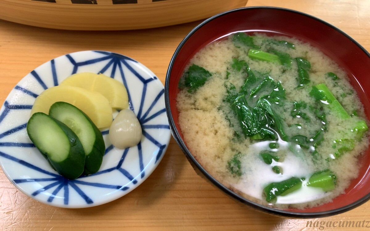 それぞれ定食には、菜の花のお味噌汁、香の物がつく。