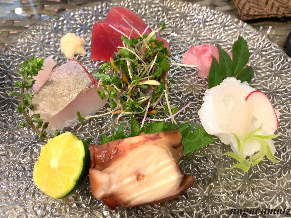 お刺身盛り合わせは、ひとつのお皿などではなく、3回にわけて色々と。