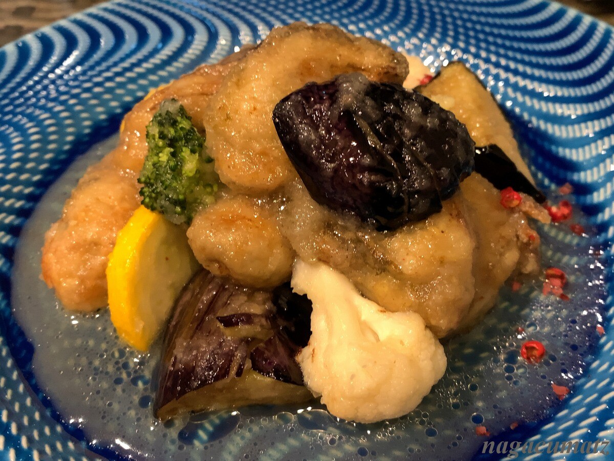 広島の大粒牡蠣と高知の新茄子の南蛮揚げ。米酢和えには、ブロッコリー、カリフラワー、ズッキーニが付く。1600円