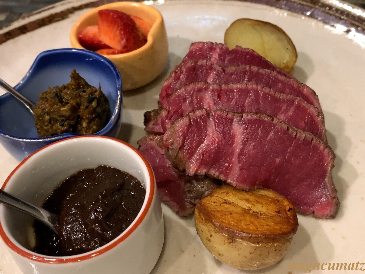フォンドボー、自家製七味、イチゴが口直しにつく。とても柔らかく非常に美味しいお肉だった。