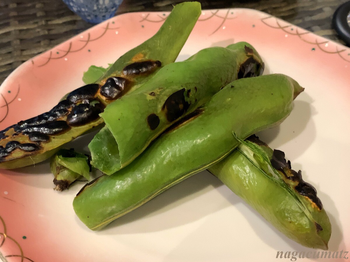 鹿児島の空豆のあぶり焼きには、昆布塩添え 殻の内側をこそいで食べるようにとスプーンが付いて来た。680円