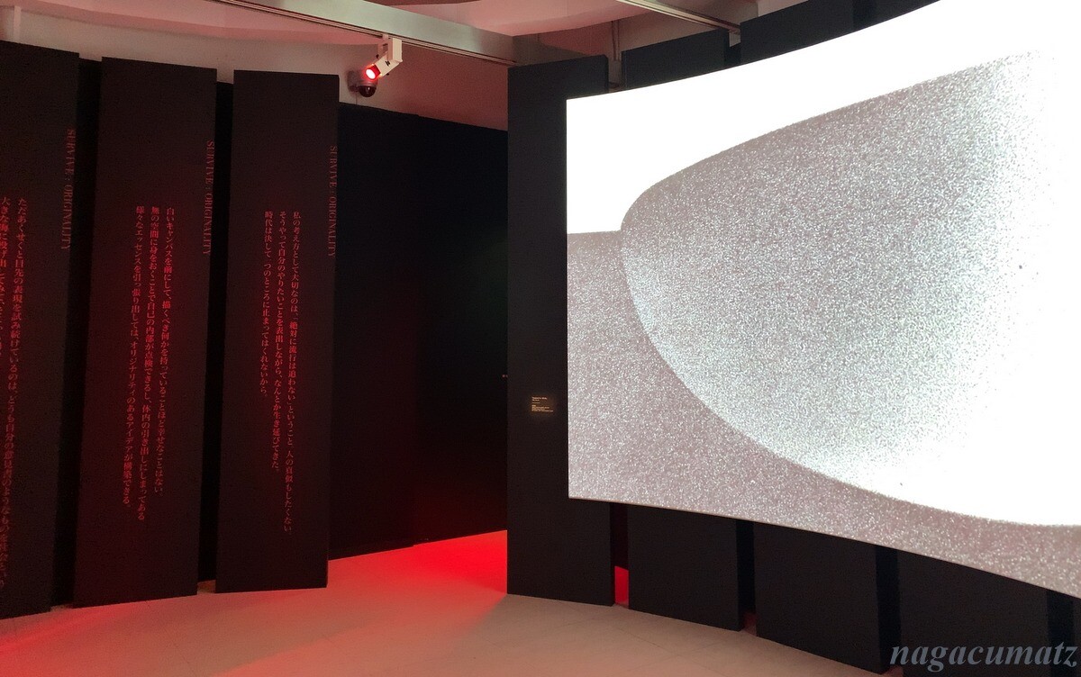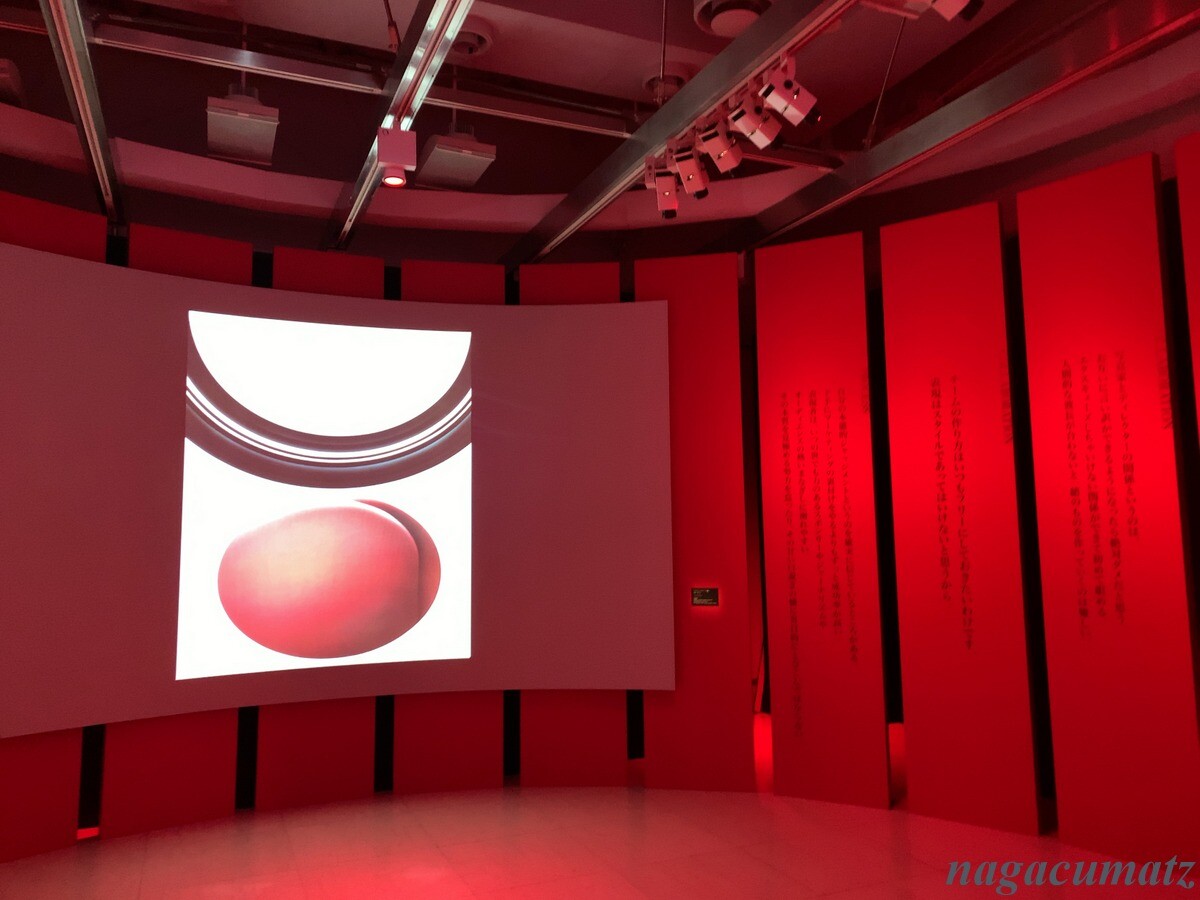 一階は赤をキーカラーとして、石岡氏の残した言葉がずらっと映像と共に展示されている。