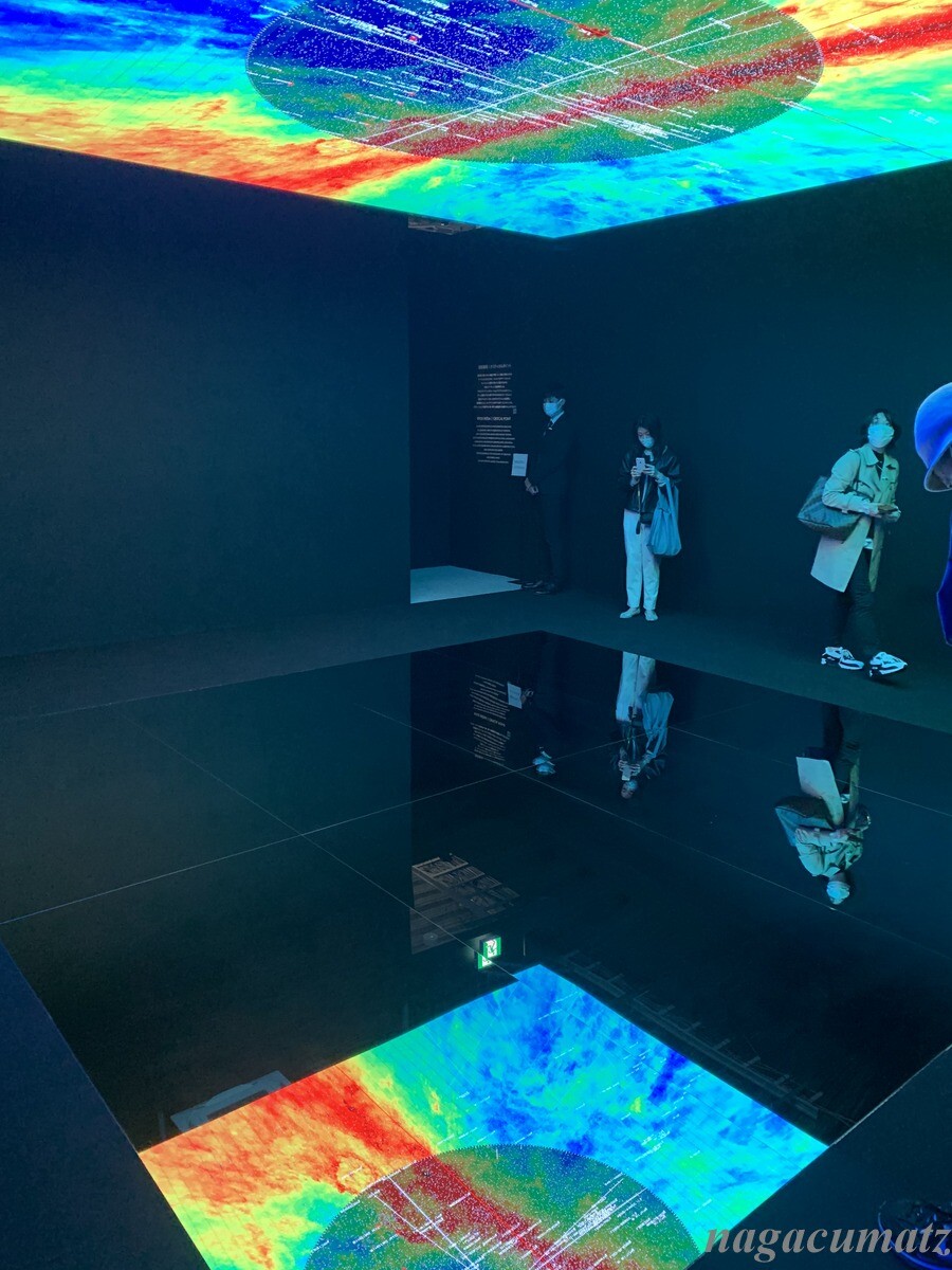 アーティスト集団「ダムタイプ」のメンバーである池田亮司によるマルチメディア ・ インスタレーション「クリティカルポイント」。ミラー仕様のフロアに、吊り下げられたLEDスクリーンが映る。今回のために制作した作品。