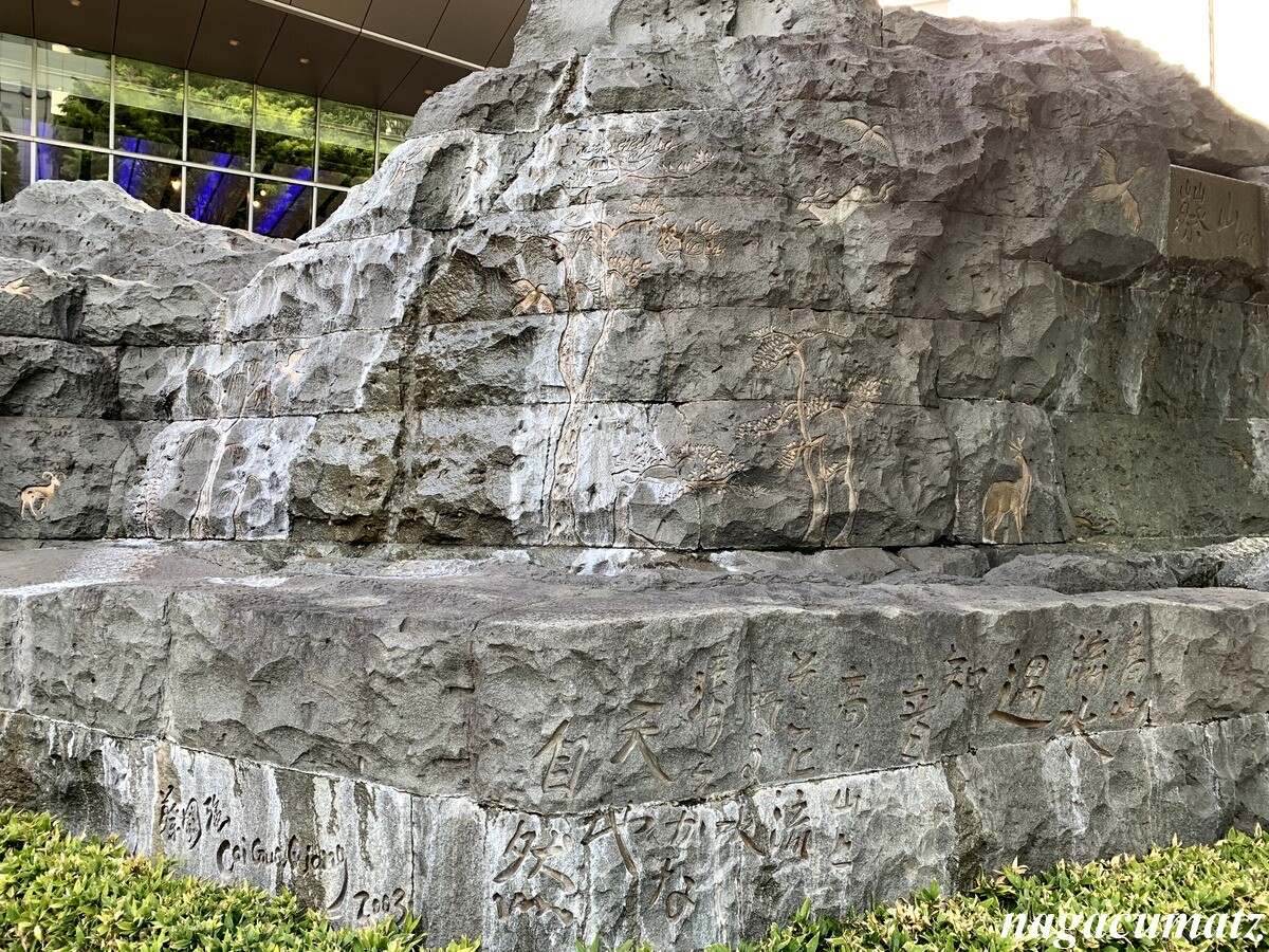 中国の故事に由来する作品。身近な原風景として存在する岩山と水景を立体化している。ホテルの入り口にあるのも意外。