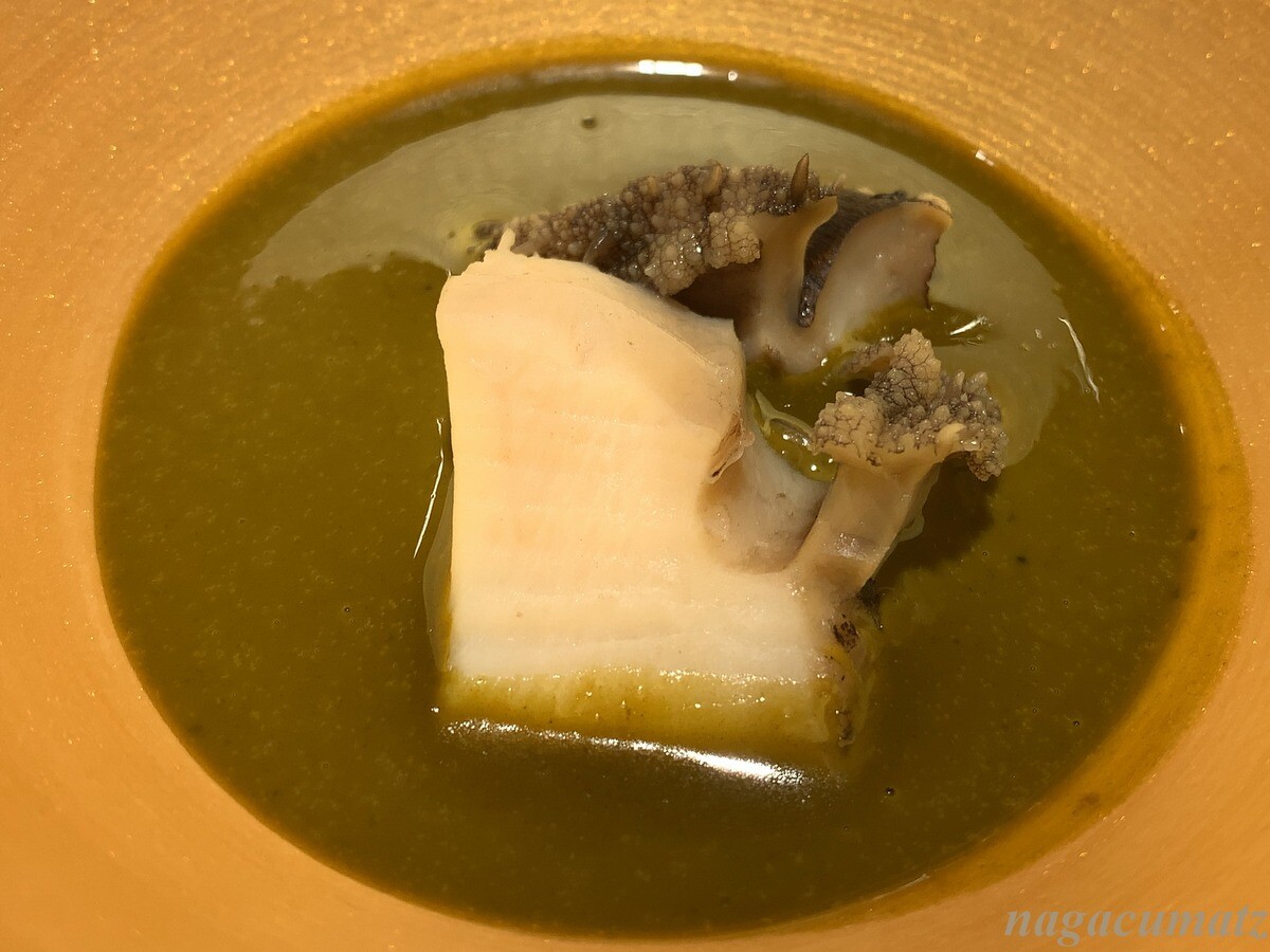 獺祭などで使われる山田錦。コロナ禍で、日本酒の売り上げも落ち、山田錦の売り上げも落ちてしまったので、販路を見出すべく山田錦を食用のお米として売るように。山田錦の内部にはデンプン質は多いが、周りには食用のお米と異なり、デンプン質が少なめ。土鍋で炊いてみてもやはり粘り気などが少ないので、リゾットのように鮑肝ソースに入れていただく。これも美味しい。