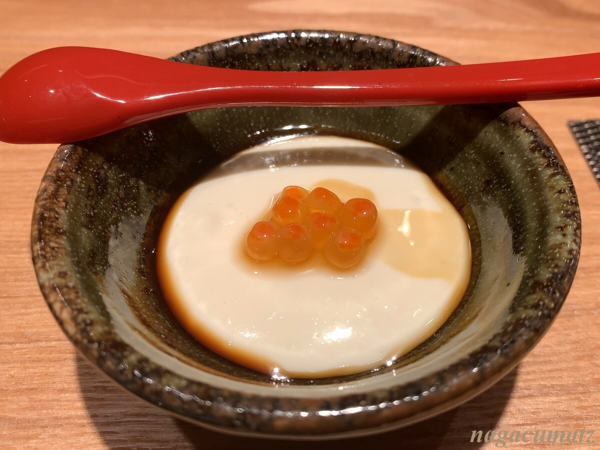 玉子をデザートとして。中には海老や大和芋が入っていて香りも良くふんわり。上には三温糖が乗せられ、バーナーで温められているので、クレームブリュレのよう。