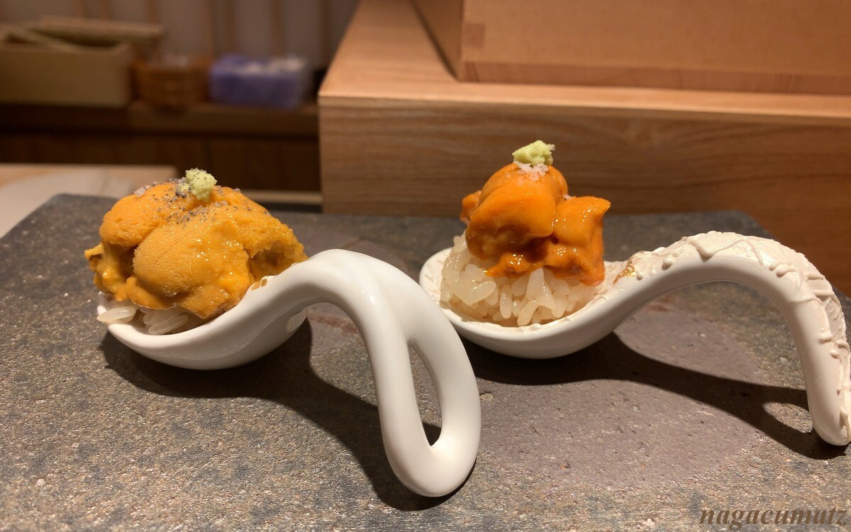 生雲丹の食べ比べ いずれも北海道産だが、右が紫雲丹、左が蝦夷馬糞雲丹。刺身 平目には、煎り酒をつけて頂く。