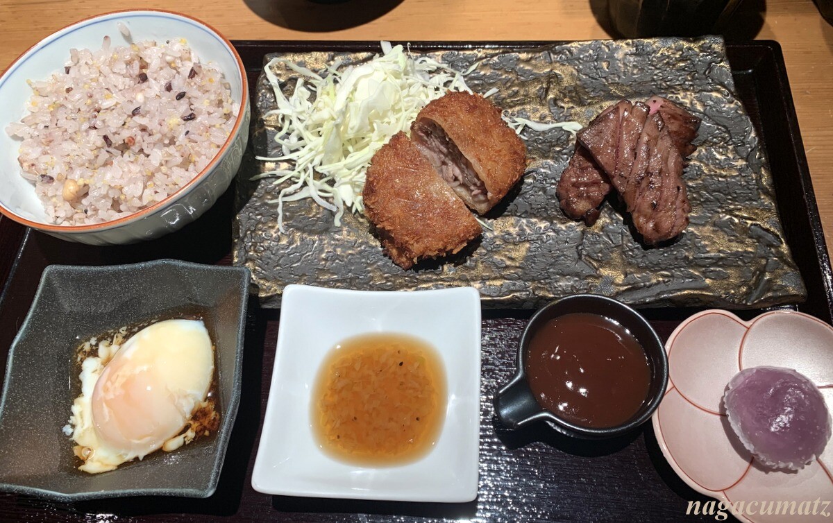 牛タンとメンチカツ の御膳 2000円弱(だったかな)これにも肉野菜スープとサラダ、御飯がお替わり自由で付く。御飯は雑穀米か白米を選択出来る。