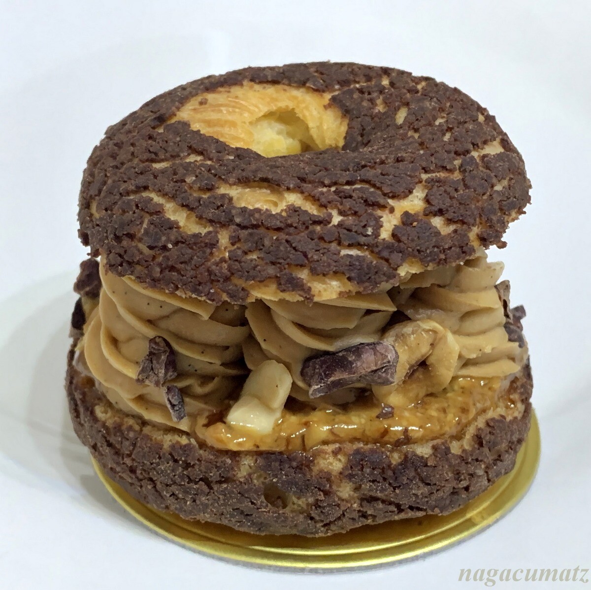 シュー生地に、コーヒークリーム、ヘーゼルナッツのムースリーヌ(カスタードクリームにバターを加えたクリーム)とプラリネ、アマゾンカカオのカカオニブ(カカオ豆をローストし細かく砕いたもの)が散らしてある。ヘーゼルナッツのお味もしっかりしていて美味しい。