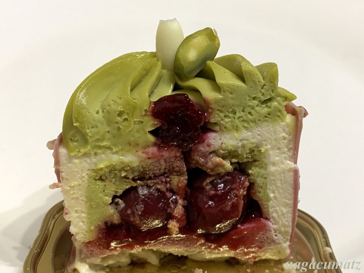 グリオット(さくらんぼ)のジュレとムース、ピスタチオのクリームとババロワにグリオットの自家製セミコンフィ、ホワイトチョコレートのムース。繊細な感じ。