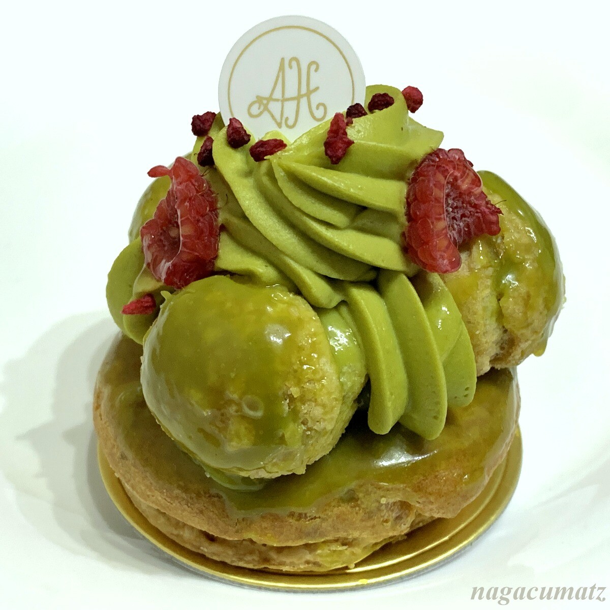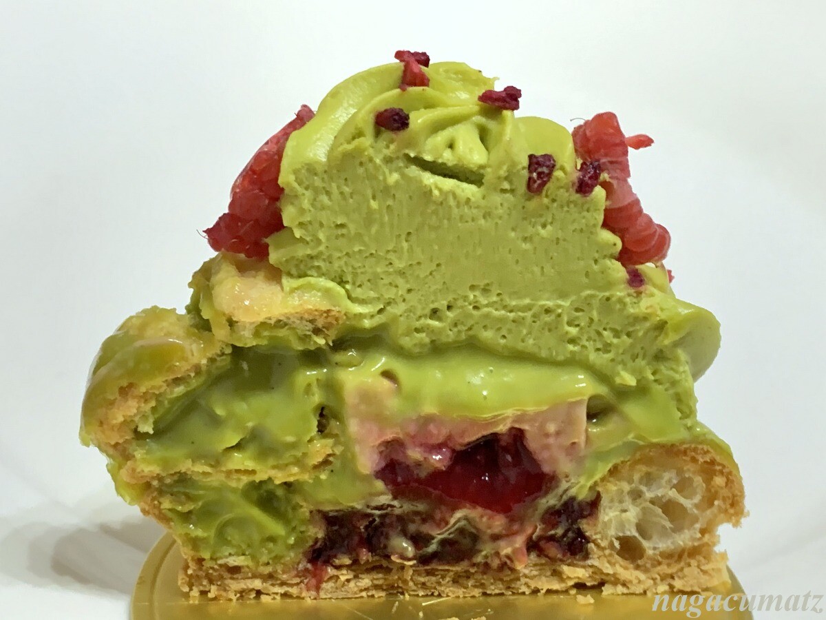 シュー生地にピスタチオのカスタードクリームとピスタチオの生クリーム、ラズベリージャム。上記のグリオット・ピスターシュと比べ、よりがっつりピスタチオと言った印象。