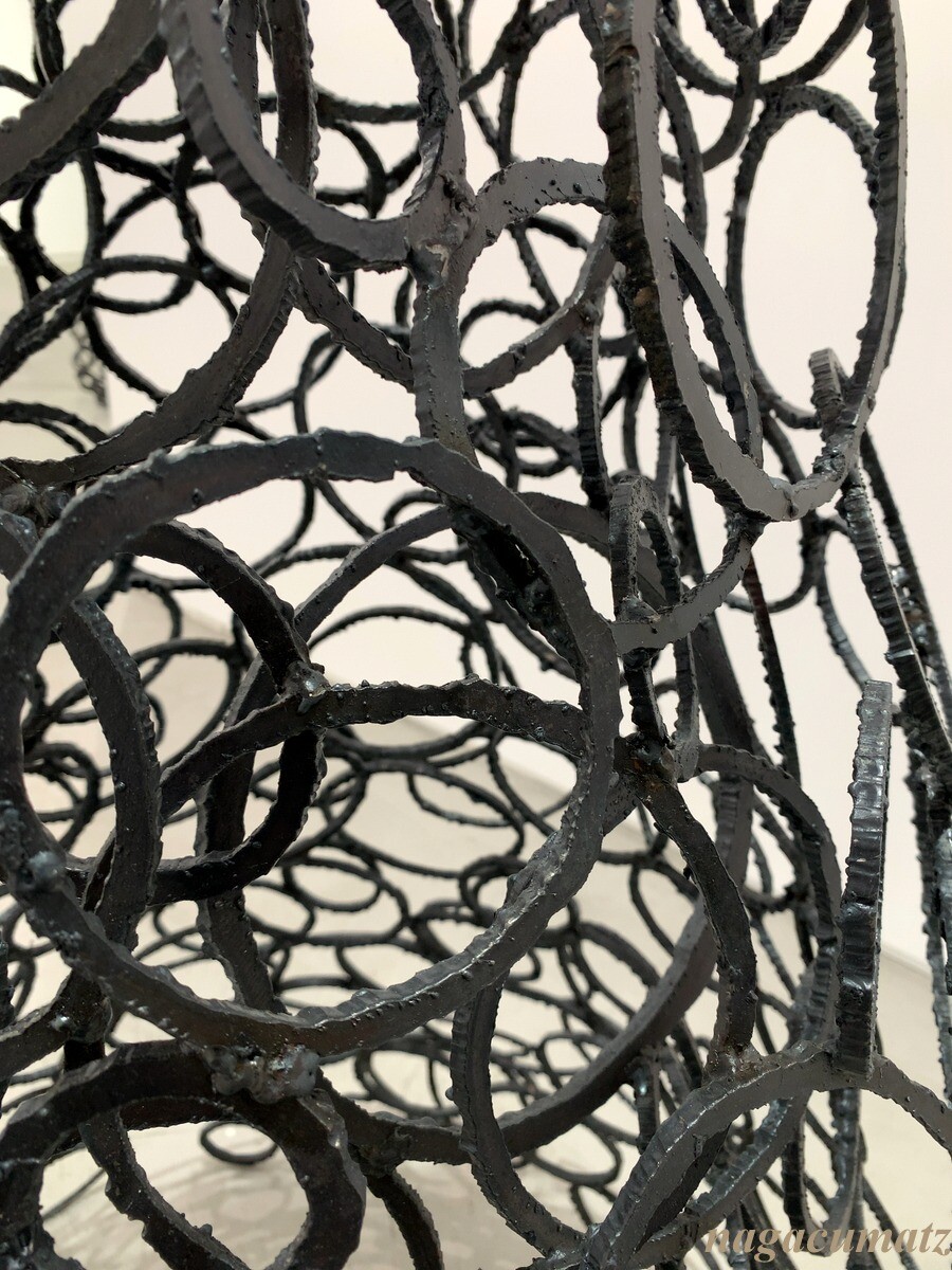 青木氏は、80年代の活動当初から鉄という素材に魅了され、工業用の鉄板をパーツに溶断し、溶接して組み上げるシンプルな作業を繰り返すことで完成する作品を制作。タイトルの「Mesocyclone」は気象用語。