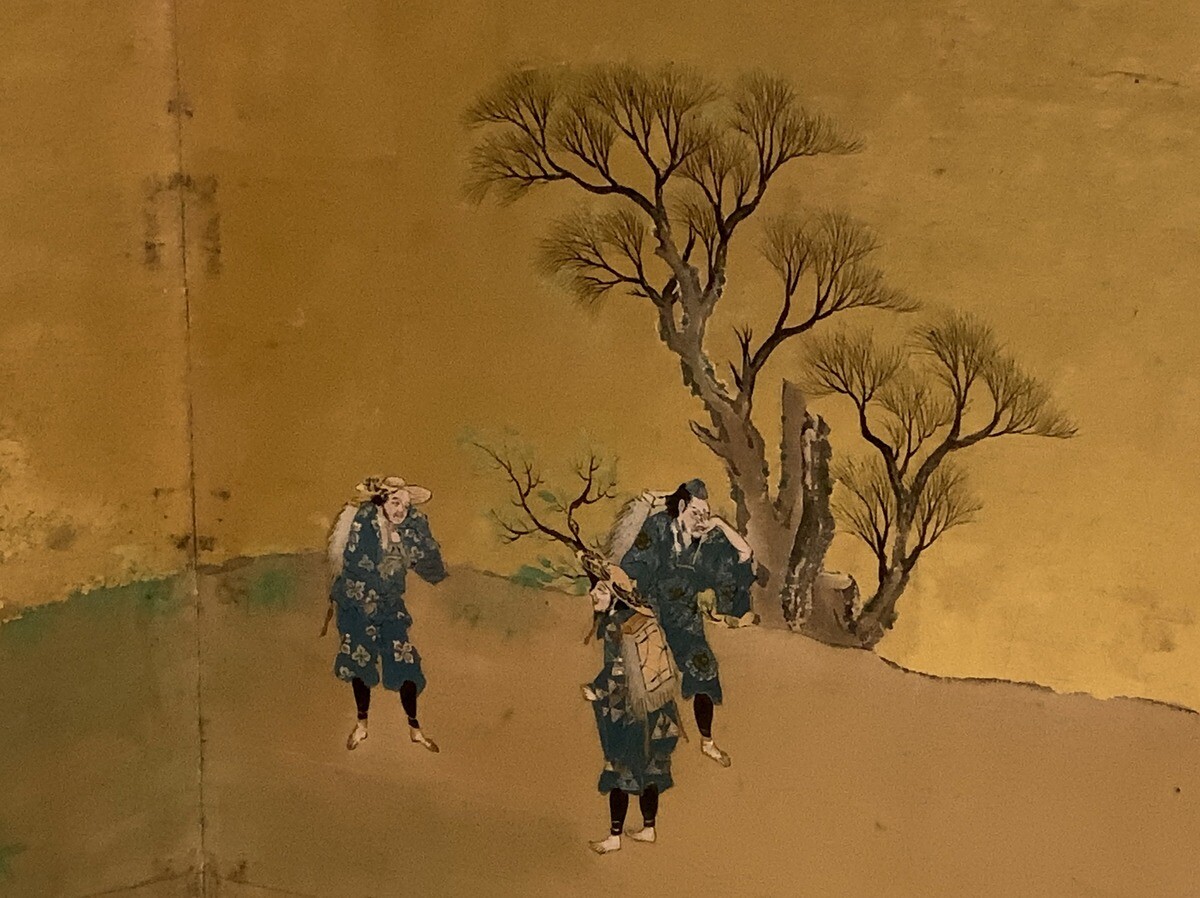 大覚寺の正寝殿を飾っていた農村風景の襖絵で、16面のうち、障子腰板貼付の8面とこの襖絵8面とからなる。今回来日したのは襖絵8面。幅8メートルに迫る大きさで、京狩野の作風を伝えている。