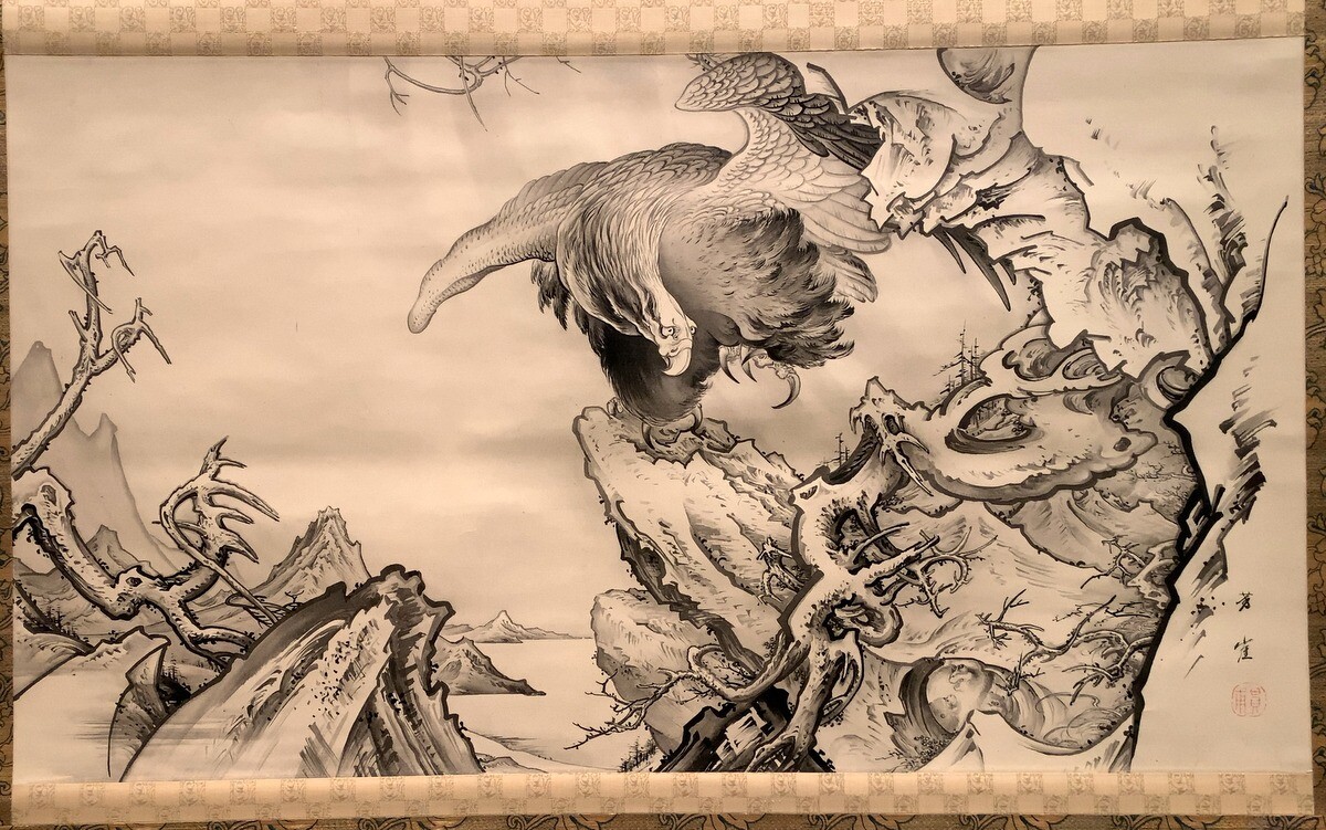 足元には3匹の猿がおびえて隠れている。墨で描かれた崖や樹木は雪舟の絵画のようだが、鷲は西洋画のような陰影をつけて立体感を生んでいる。近代日本画の父。