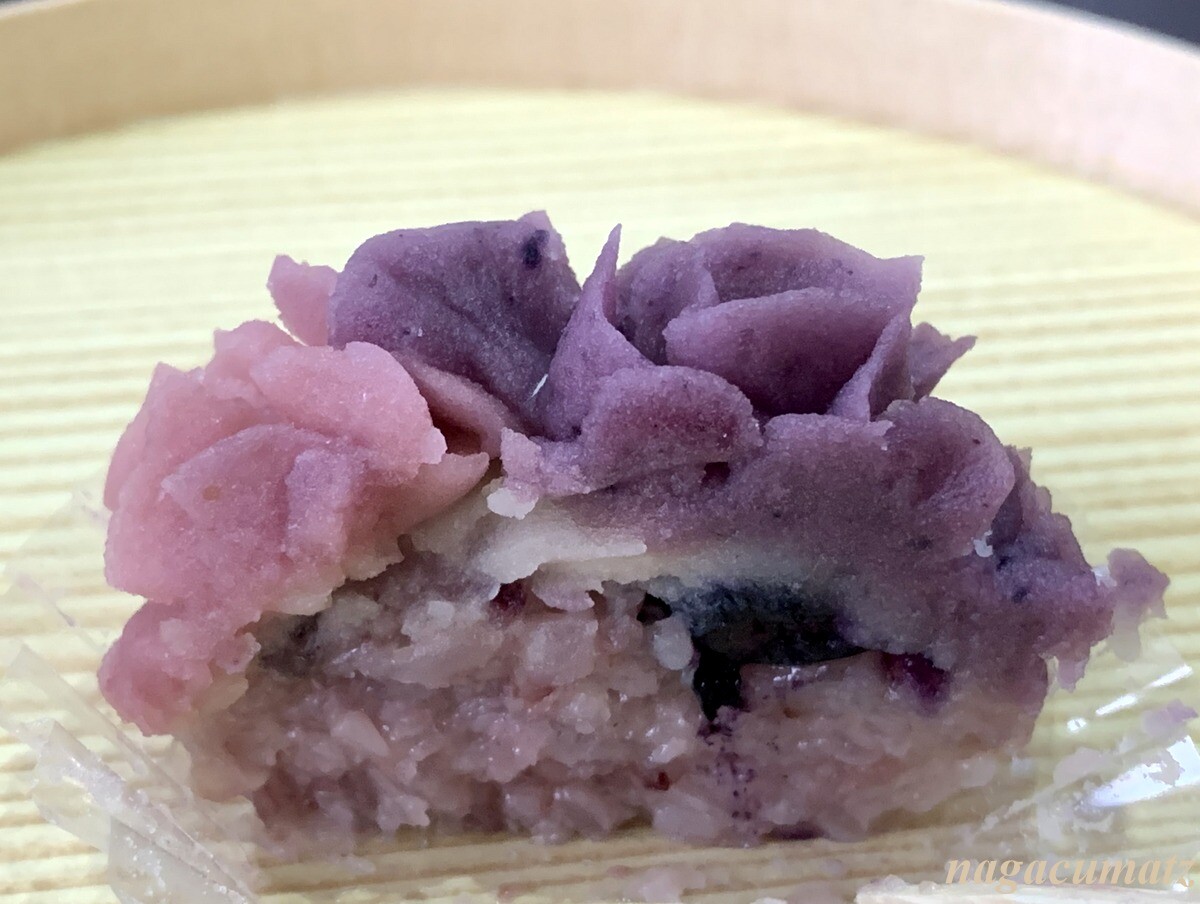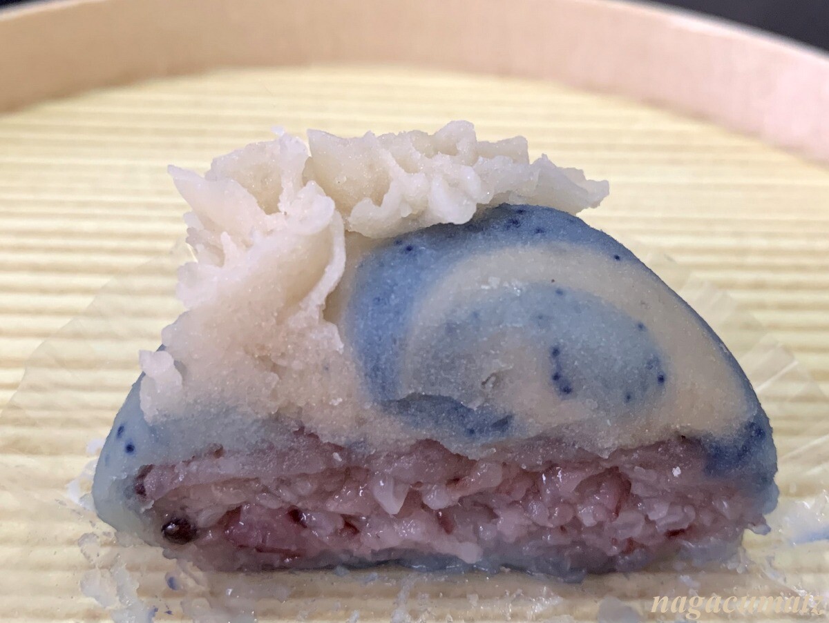 北斎 上の白い餡にはライチピューレが練り込まれ、青の混ざった部分の餡は少し塩分が入っている。