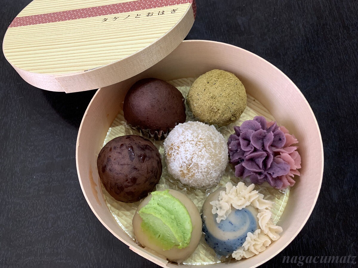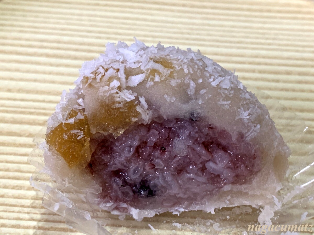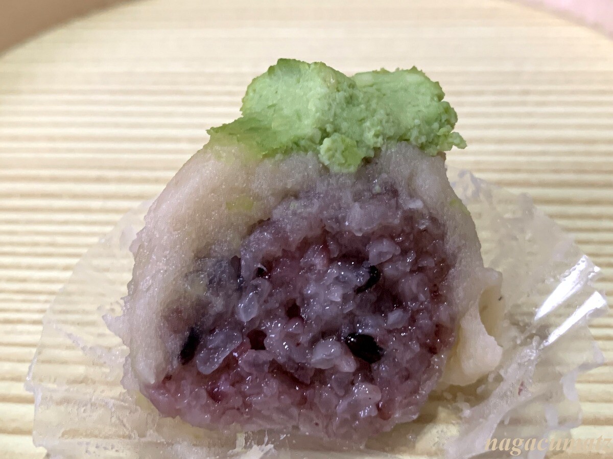 この日の7種類は、粒餡、漉し餡、麻の実ときな粉、紫陽花、北斎、ココナッツとレモンピール、山葵と枝豆。1860円。粒餡、漉し餡、麻の実ときな粉は以前に買った時と同じなので、他の5種類をカットしてみた。前回の様子はこちら