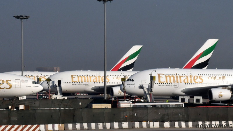 ドバイ到着。飛行場には、エミレーツの2階建てが何機も。