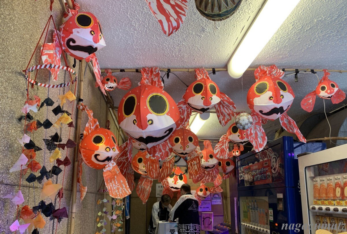 入り口には五輪に基づいた金魚のはりぼてが迎えてくれる。