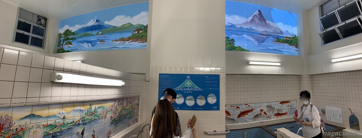 そのひとつのイベントとして「TOKYO SENTO Festival 2020」がある。伝統的な人々の憩いの場・コミュニティーである日本独自の銭湯文化を世界に発信し、2021年の東京を多くの人々とともに盛り上げるアートプロジェクト。東京都内約500ヶ所の銭湯が参加し、暖簾アートが披露され、スタンプラリーにより特製てぬぐいがもらえるなど。そして、4つの銭湯が銭湯アート会場として各一日の所定の時間だけ一般公開していたので、銀座金春湯に行ってみた。