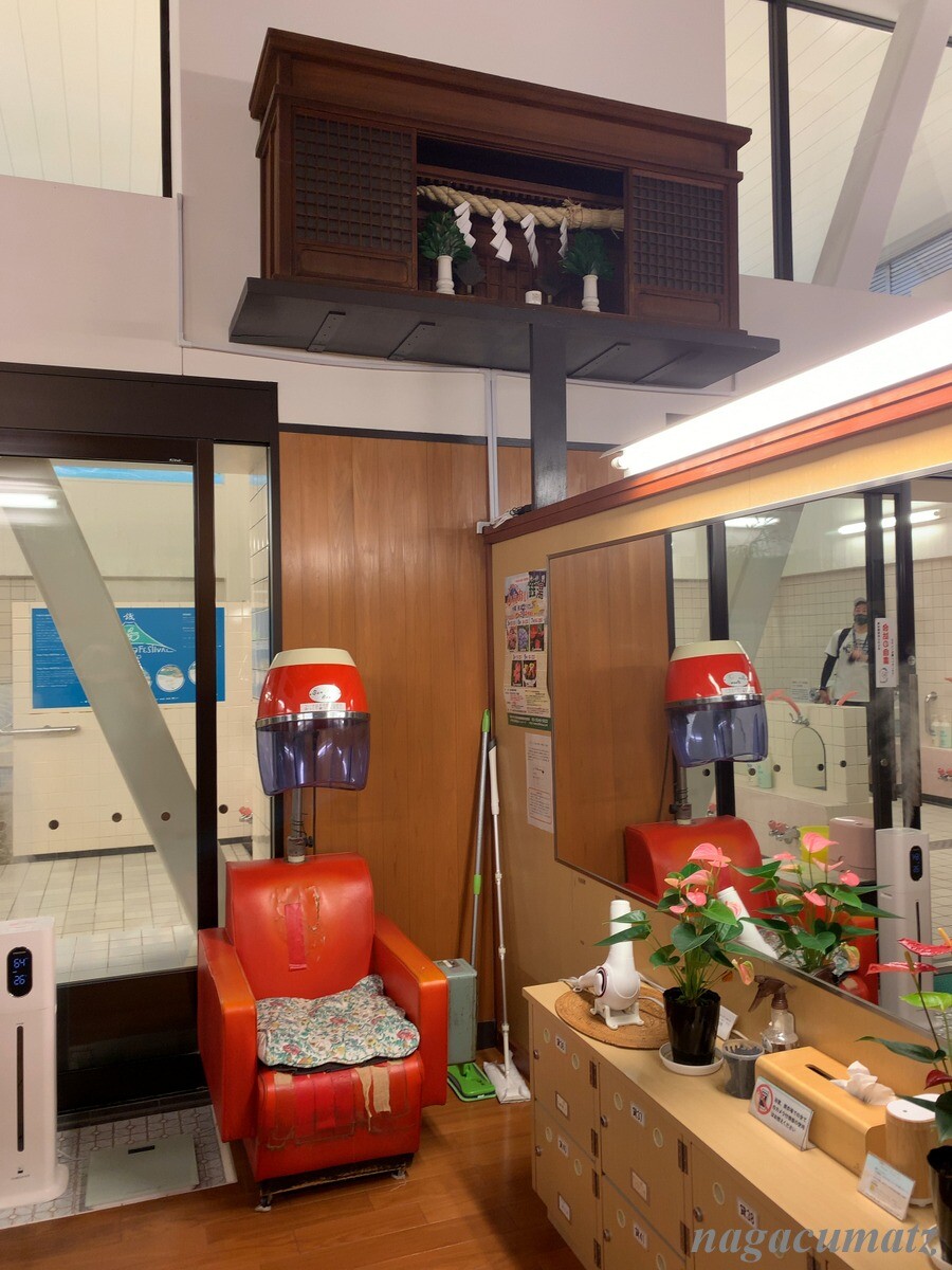 大正時代からの神棚がある。女湯側には、凄くレトロなドライヤーが今も現役だったりする!