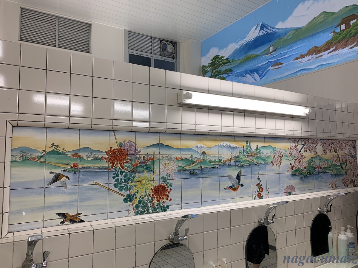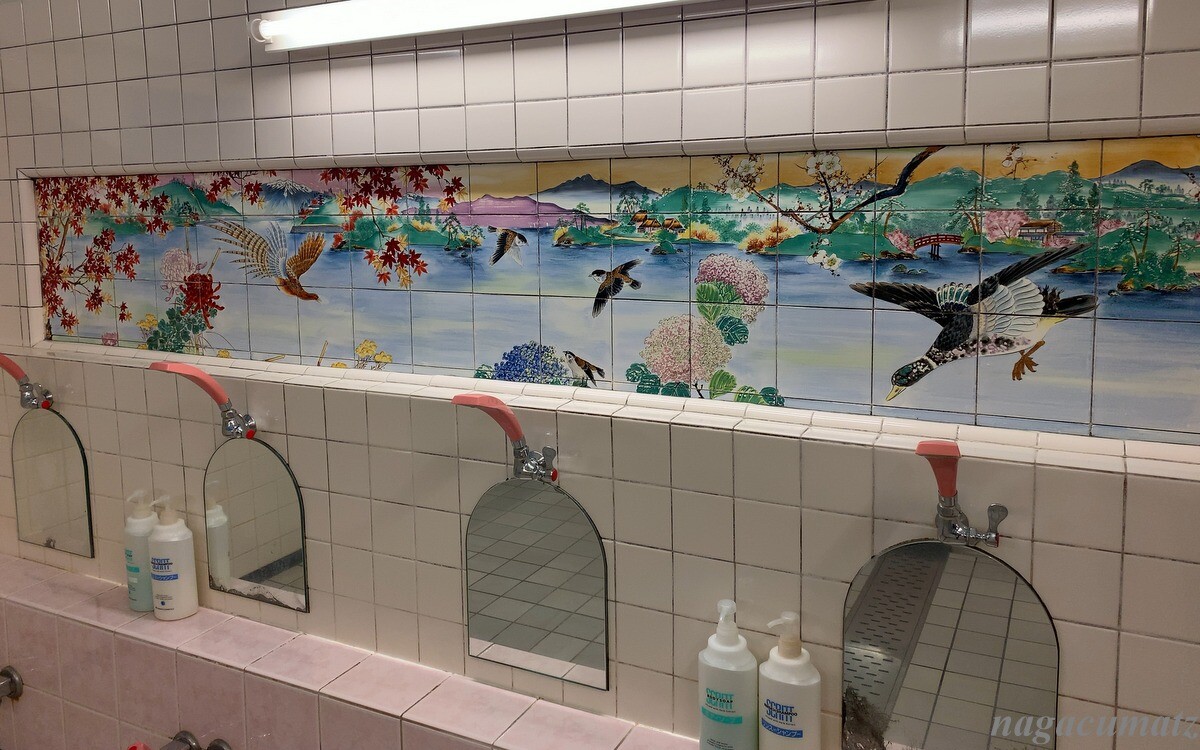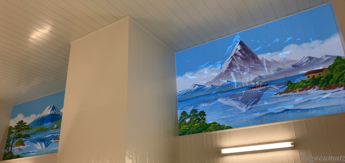 男女湯のそれぞれには、大原大次郎氏の「湯覧線」と言うペンキ絵とプロジェクションマッピングのコラボの作品を見ることが出来る。
