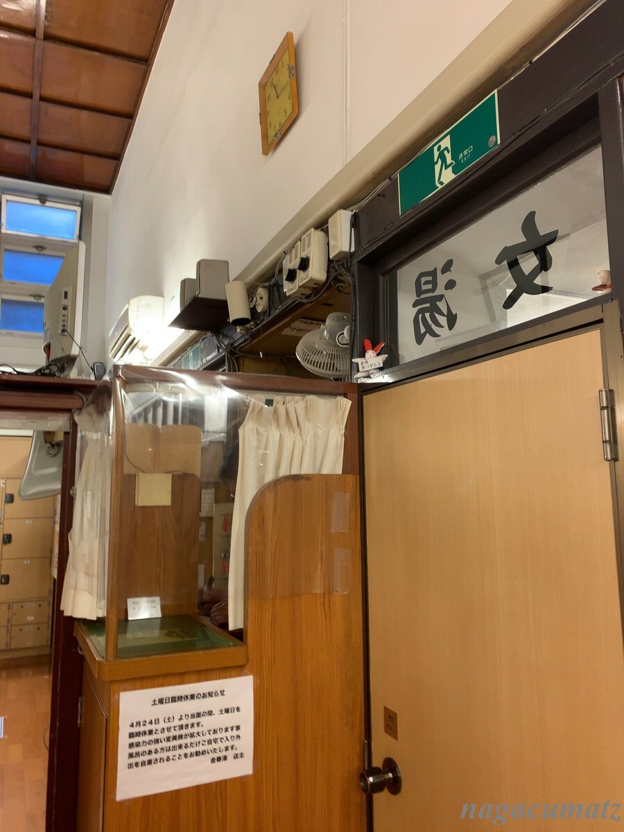 普通に番台もある! 2階分の吹き抜けになっている天井は格天井。